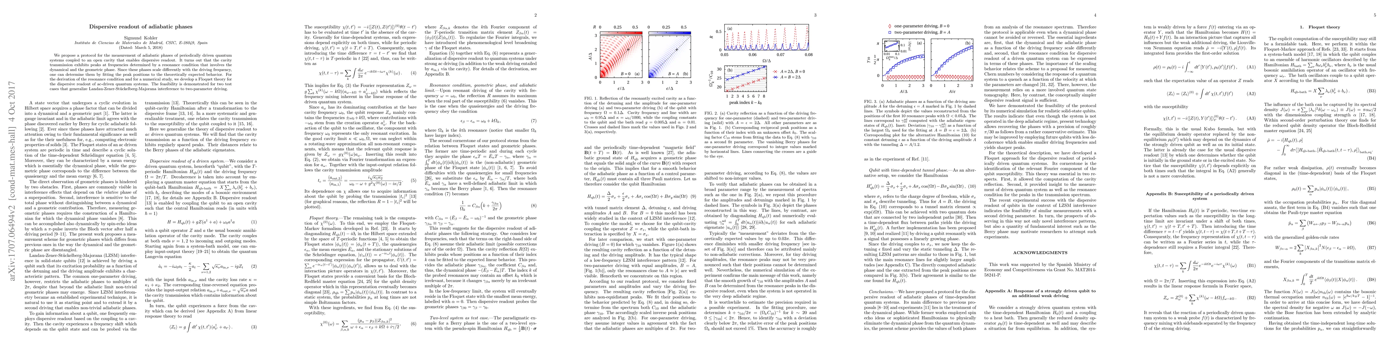 This paper proposes a dispersive readout method for measuring adiabatic phases in periodically driven quantum systems coupled to an open cavity. The method leverages cavity transmission peaks determined by a resonance condition involving both dynamical and geometric phases, allowing for their determination through peak fitting.