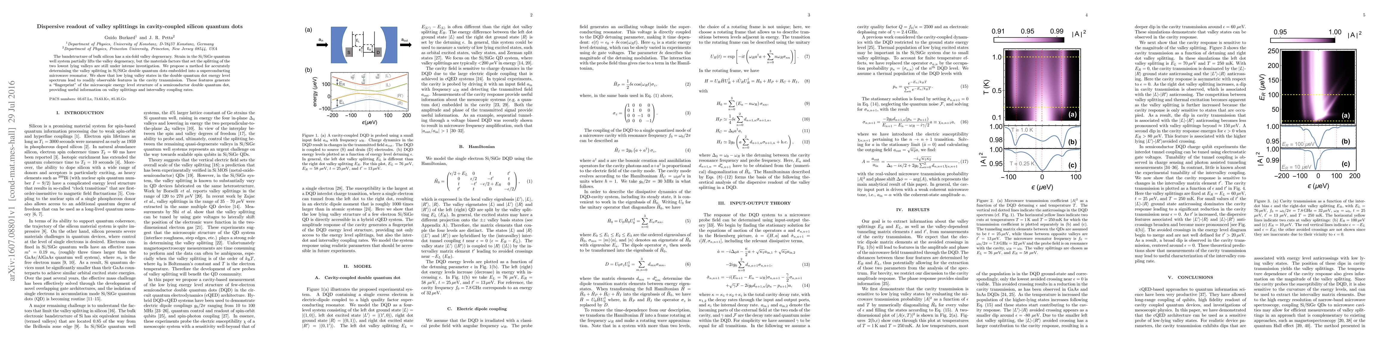 This paper proposes a method for accurately determining valley splittings in silicon/silicon germanium quantum dots using dispersive readout within a superconducting microwave resonator. The method reveals observable features in the cavity transmission that provide a "fingerprint" of the microscopic energy level structure, offering valuable information on valley splittings and intervalley coupling rates.