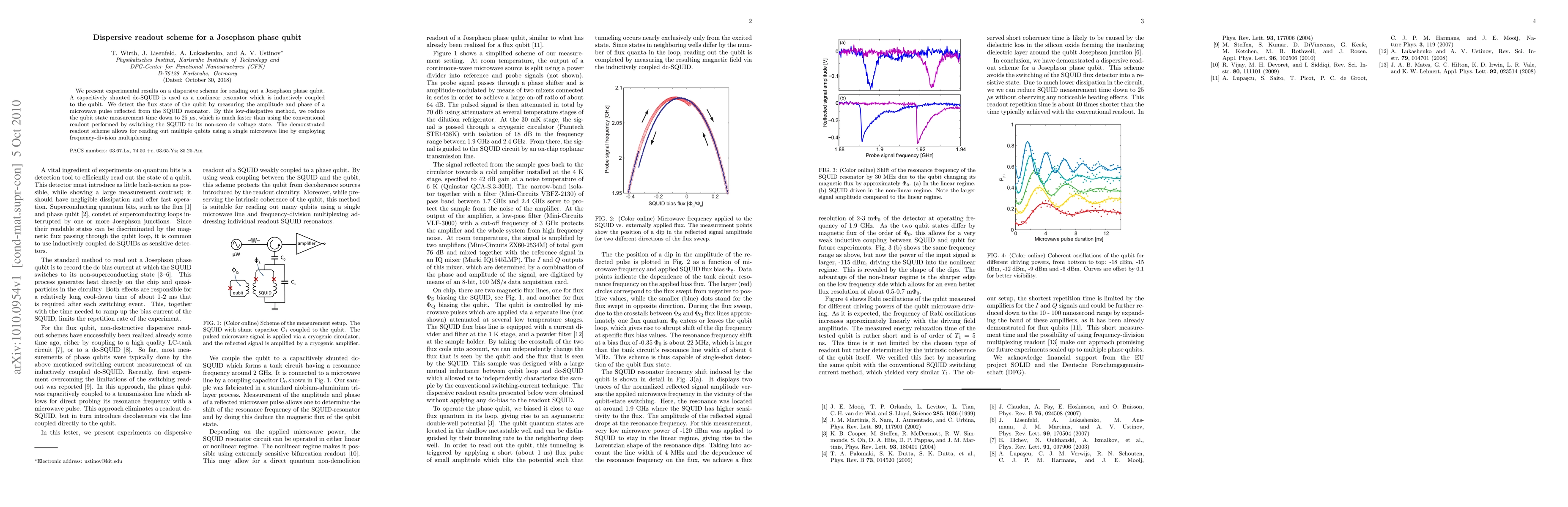 This paper introduces a dispersive readout method for a Josephson phase qubit using a capacitively shunted dc-SQUID as a nonlinear resonator, enabling faster measurement of qubit state in 25 microseconds via reflected microwave pulse analysis, and supports frequency-division multiplexing for multiple qubit readout.