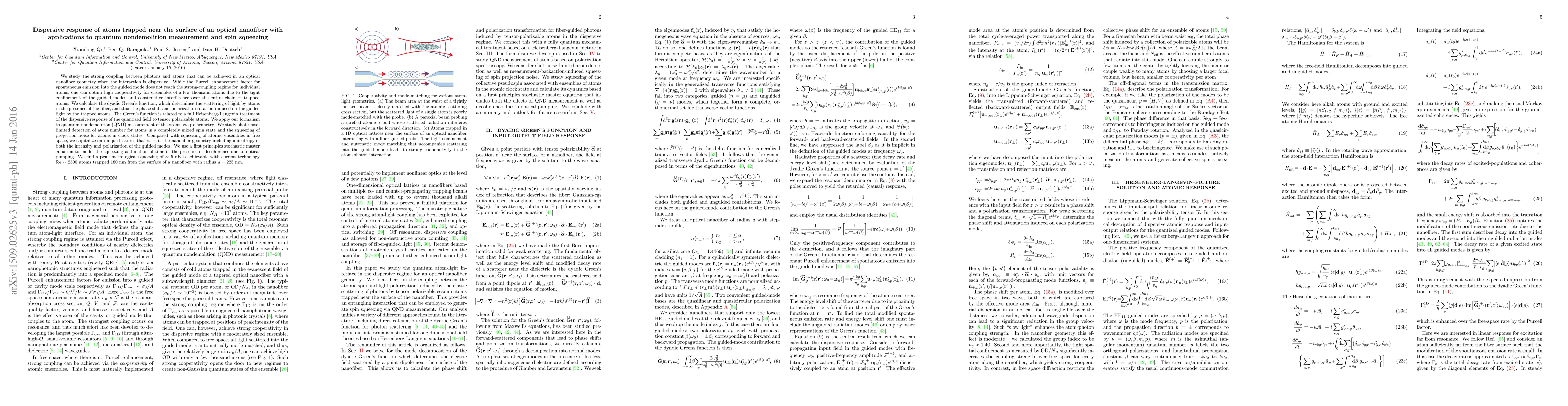 This paper investigates the strong dispersive coupling between photons and atoms trapped near an optical nanofiber, achieving high cooperativity for ensembles of atoms. It explores quantum nondemolition measurement and spin squeezing applications, finding a peak metrological squeezing of ~5 dB achievable with current technology for ~2500 atoms.