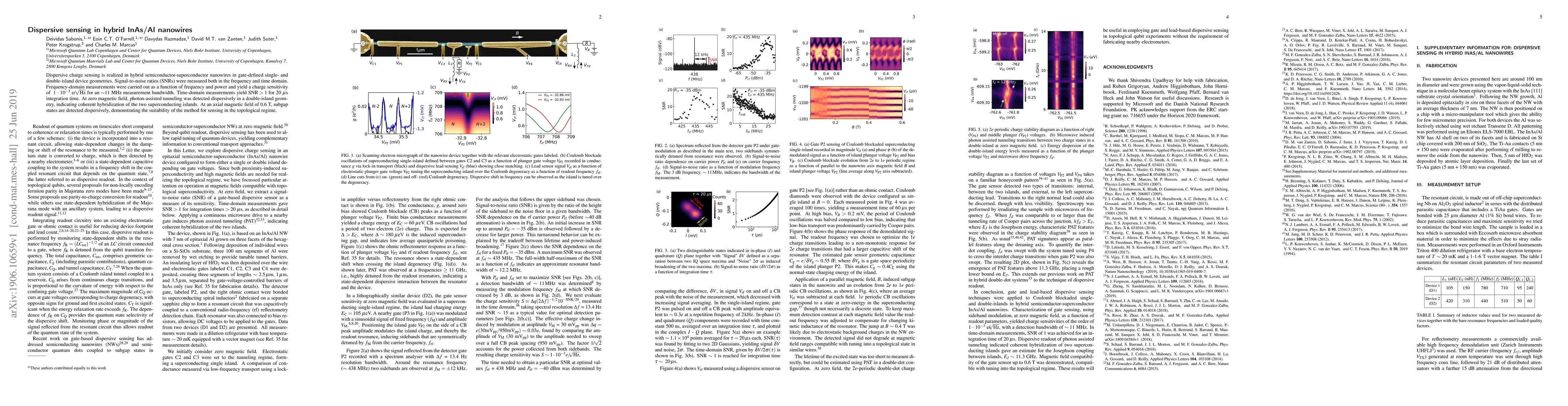 Dispersive charge sensing is realized in hybrid semiconductor-superconductor nanowires in gate-defined single- and double-island device geometries. Signal-to-noise ratios (SNRs) were measured both in the frequency and time domain. Frequency-domain measurements were carried out as a function of frequency and power and yield a charge sensitivity of $1 \times 10^{-3} e/\sqrt{\rm Hz}$ for an 11 MHz measurement bandwidth. Time-domain measurements yield SNR > 1 for 20 $\mu$s integration time. At zero magnetic field, photon-assisted tunneling was detected dispersively in a double-island geometry, indicating coherent hybridization of the two superconducting islands. At an axial magnetic field of 0.6 T, subgap states are detected dispersively, demonstrating the suitability of the method for sensing in the topological regime.