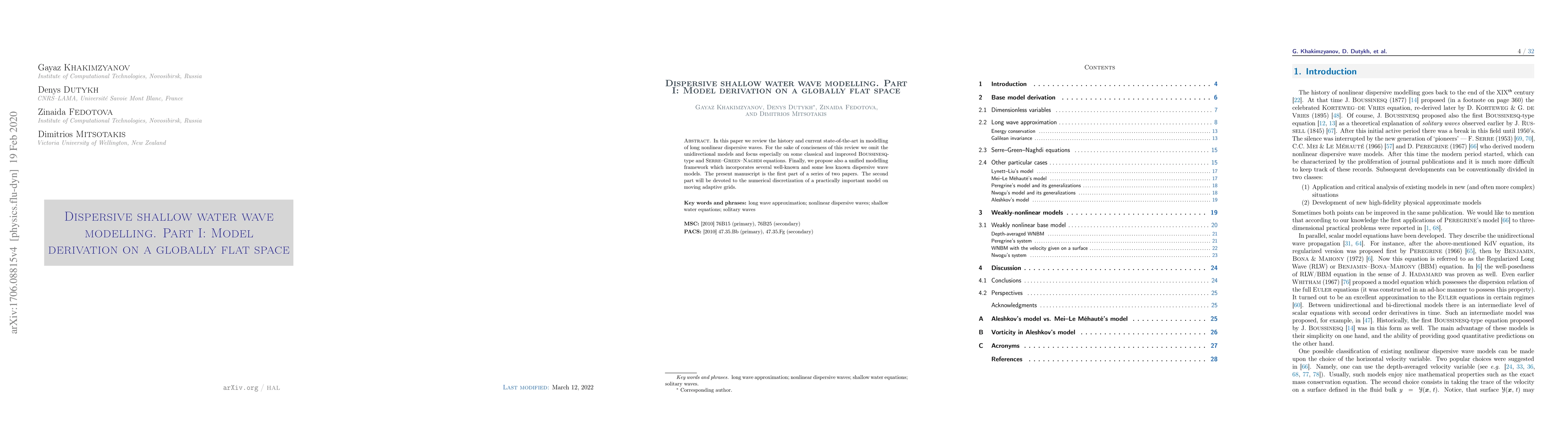 In this paper, we review the history and current state-of-the-art in the modelling of long nonlinear dispersive waves. For the sake of conciseness of this review, we omit the unidirectional models and focus especially on some classical and improved Boussinesq-type and Serre-Green-Naghdi equations. Finally, we propose also a unified modelling framework which incorporates several well-known and some less known dispersive wave models. The present manuscript is the first part of a series of two papers. The second part will be devoted to the numerical discretization of a practically important model on moving adaptive grids.