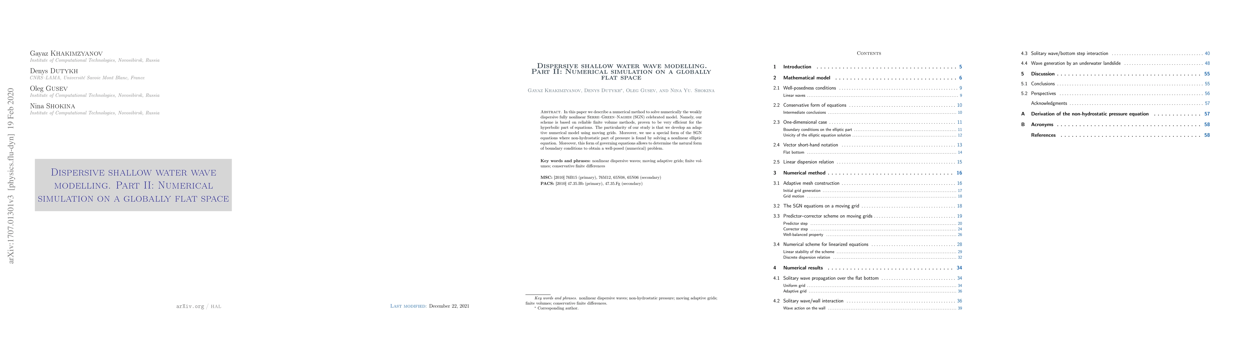 In this paper, we describe a numerical method to solve numerically the weakly dispersive fully nonlinear Serre-Green-Naghdi (SGN) celebrated model. Namely, our scheme is based on reliable finite volume methods, proven to be very effective for the hyperbolic part of equations. The particularity of our study is that we develop an adaptive numerical model using moving grids. Moreover, we use a special form of the SGN equations where non-hydrostatic part of pressure is found by solving a nonlinear elliptic equation. Moreover, this form of governing equations allows determining the natural form of boundary conditions to obtain a well-posed (numerical) problem.