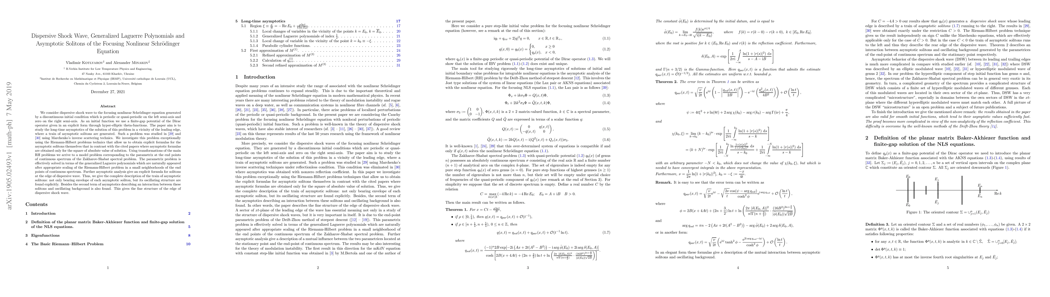 We consider dispersive shock wave to the focusing nonlinear Schr\"odinger equation generated by a discontinuous initial condition which is periodic or quasi-periodic on the left semi-axis and zero on the right semi-axis. As an initial function we use a finite-gap potential of the Dirac operator given in an explicit form through hyper-elliptic theta-functions. The paper aim is to study the long-time asymptotics of the solution of this problem in a vicinity of the leading edge, where a train of asymptotic solitons are generated. Such a problem was studied in \cite{KK86} and \cite{K91} using Marchenko's inverse scattering technics. We investigate this problem exceptionally using the Riemann-Hilbert problems technics that allow us to obtain explicit formulas for the asymptotic solitons themselves that in contrast with the cited papers where asymptotic formulas are obtained only for the square of absolute value of solution. Using transformations of the main RH problems we arrive to a model problem corresponding to the parametrix at the end points of continuous spectrum of the Zakharov-Shabat spectral problem. The parametrix problem is effectively solved in terms of the generalized Laguerre polynomials which are naturally appeared after appropriate scaling of the Riemann-Hilbert problem in a small neighborhoods of the end points of continuous spectrum. Further asymptotic analysis give an explicit formula for solitons at the edge of dispersive wave. Thus, we give the complete description of the train of asymptotic solitons: not only bearing envelope of each asymptotic soliton, but its oscillating structure are found explicitly. Besides the second term of asymptotics describing an interaction between these solitons and oscillating background is also found. This gives the fine structure of the edge of dispersive shock wave.