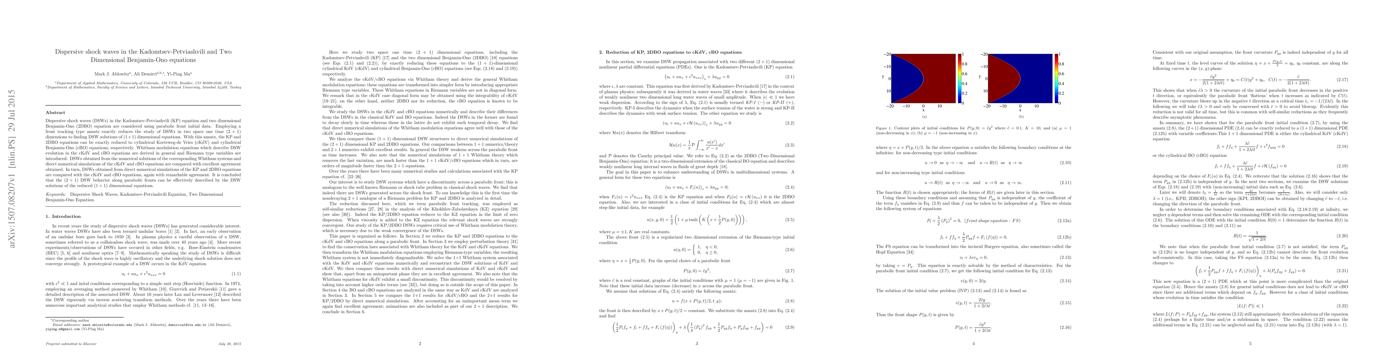 This paper investigates dispersive shock waves in the Kadomtsev-Petviashvili and two dimensional Benjamin-Ono equations using parabolic front initial data. It demonstrates that the (2+1) dimensional DSW behavior can be effectively described by solutions of reduced (1+1) dimensional cylindrical Korteweg-de Vries and Benjamin-Ono equations, showing remarkable agreement between numerical simulations.