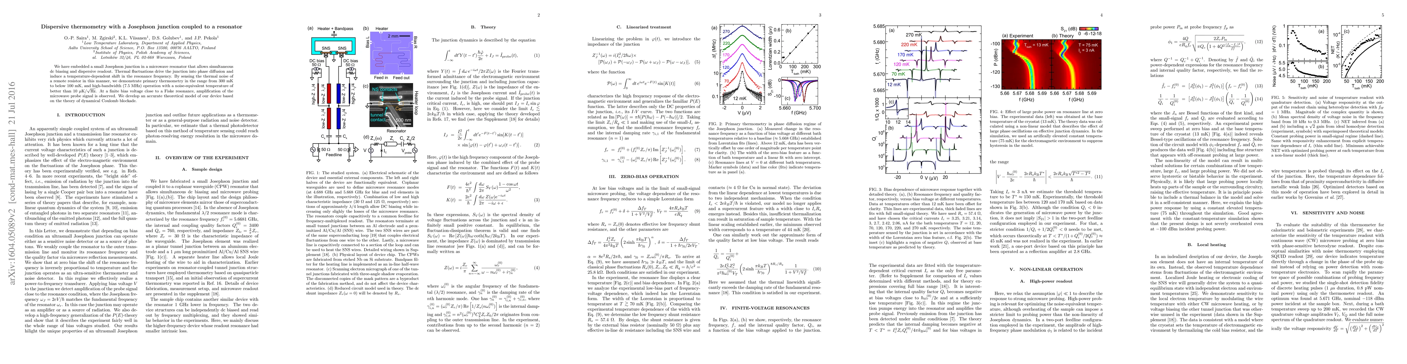 This paper presents a novel thermometry technique using a Josephson junction in a microwave resonator, achieving primary thermometry from 300 mK to below 10 mK with a high-bandwidth operation and low noise-equivalent temperature. The method leverages thermal fluctuations and phase diffusion to sense temperature-dependent shifts in resonance frequency.