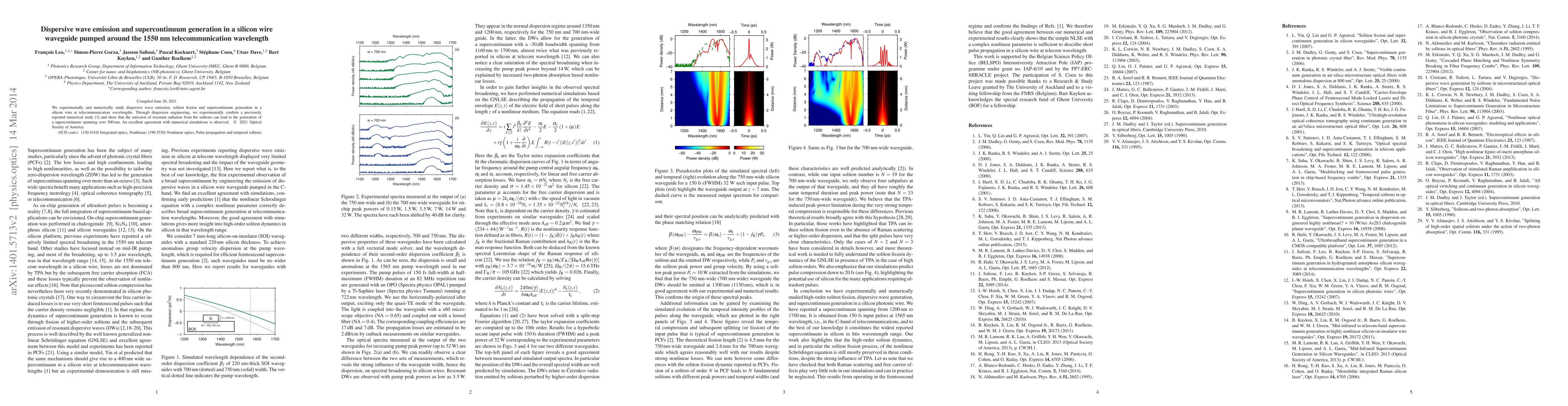 This paper investigates the generation of dispersive waves, soliton fission, and supercontinuum in a silicon wire waveguide pumped at 1550 nm. Experimental results confirm numerical predictions, demonstrating the emission of resonant radiation from solitons that leads to a supercontinuum spanning over 500 nm, with strong agreement between simulations and experiments.
