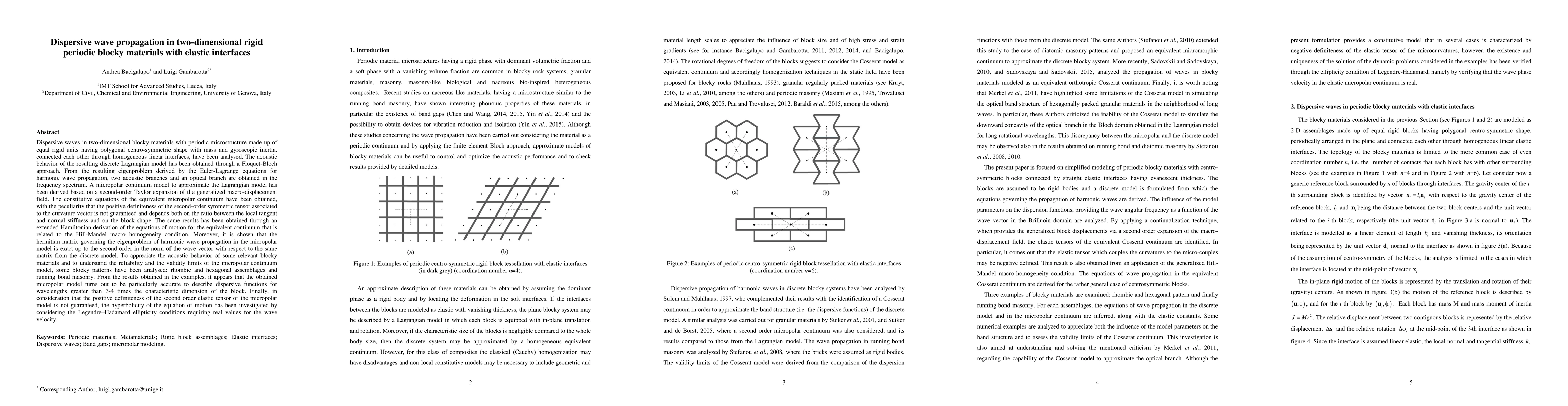 Researchers studied acoustic behavior in two-dimensional rigid periodic blocky materials with elastic interfaces, finding that they exhibit distinct acoustic branches and an optical branch in their frequency spectrum.