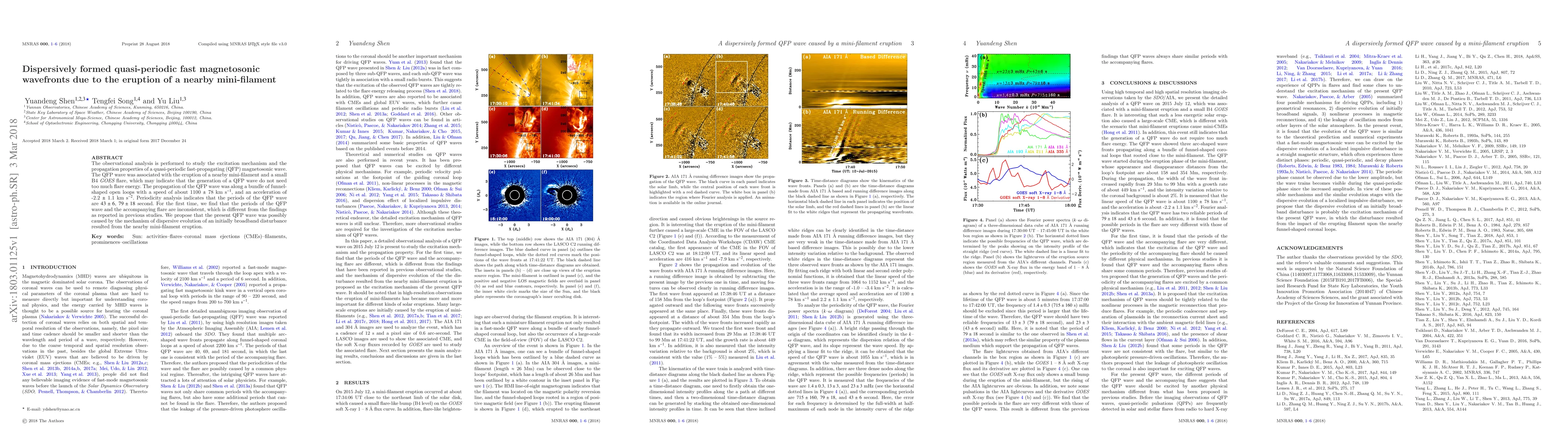 The observational analysis is performed to study the excitation mechanism and the propagation properties of a quasi-periodic fast-propagating (QFP) magnetosonic wave. The QFP wave was associated with the eruption of a nearby mini-filament and a small B4 GOES flare, which may indicate that the generation of a QFP wave do not need too much flare energy. The propagation of the QFP wave was along a bundle of funnel-shaped open loops with a speed of about 1100+/-78, and an acceleration of -2.2+/-1.1. Periodicity analysis indicates that the periods of the QFP wave are 43+/-6, 79+/-18 second. For the first time, we find that the periods of the QFP wave and the accompanying flare are inconsistent, which is different from the findings as reported in previous studies. We propose that the present QFP wave was possibly caused by the mechanism of dispersive evolution of an initially broadband disturbance resulted from the nearby mini-filament eruption.