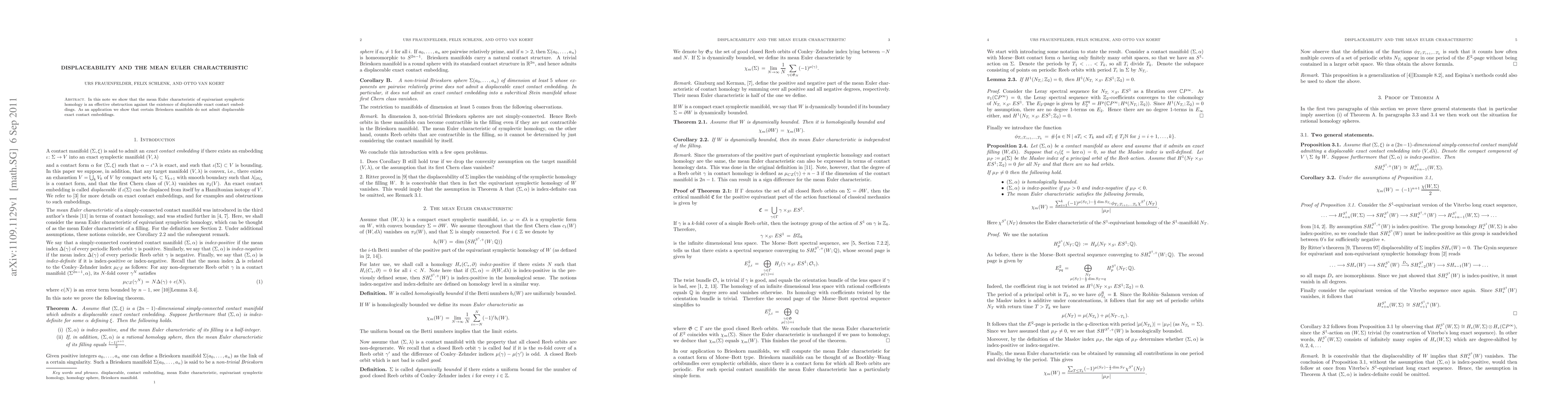 Summary: The paper demonstrates that the mean Euler characteristic of equivariant symplectic homology serves as an effective obstruction to displaceable exact contact embeddings, and applies this to show that certain Brieskorn manifolds lack such embeddings.