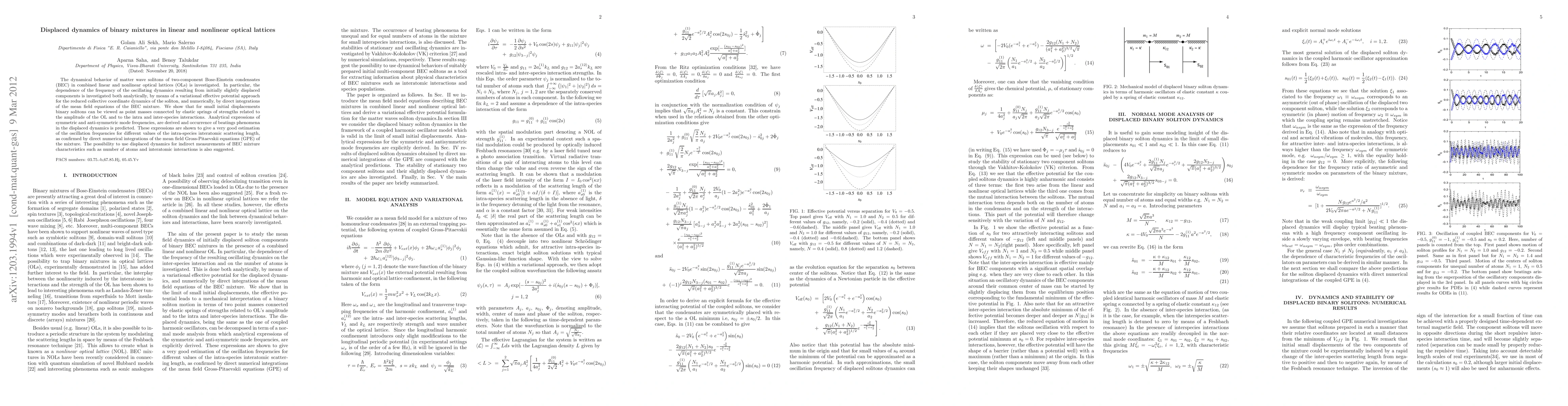 This research investigates the movement of two-component Bose-Einstein condensate solitons in combined linear and nonlinear optical lattices. Using analytical and numerical methods, it shows that these solitons can be modeled as point masses connected by springs, with oscillation frequencies dependent on lattice and interaction strengths. The study predicts beating phenomena and suggests using displaced dynamics for indirectly measuring BEC mixture characteristics.
