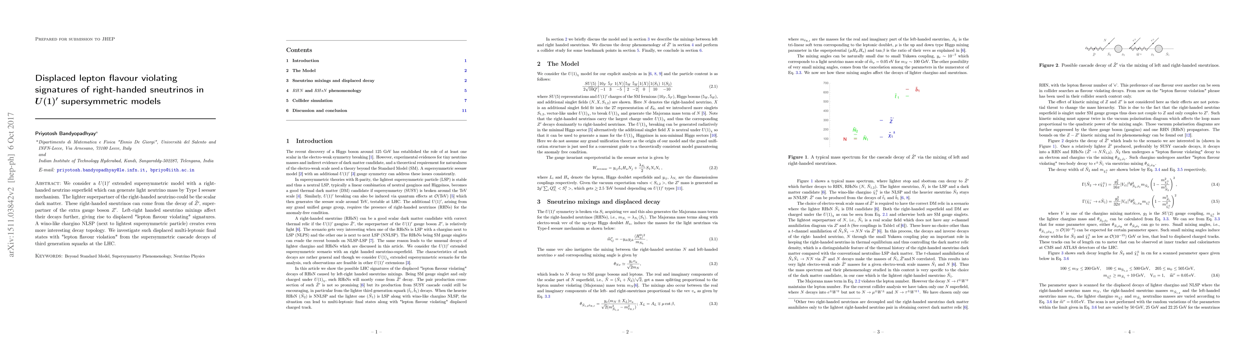 We consider a $U(1)'$ extended supersymmetric model with a right-handed neutrino superfield which can generate light neutrino mass by Type I seesaw mechanism. The lighter superpartner of the right-handed neutrino could be the scalar dark matter. These right-handed sneutrinos can come from the decay of $\tilde{Z'}$, superpartner of the extra gauge boson $Z'$. Left-right handed sneutrino mixings affect their decays further, giving rise to displaced "lepton flavour violating" signatures. A wino-like chargino NLSP (next to lightest supersymmetric particle) creates even more interesting decay topology. We investigate such displaced multi-leptonic final states with "lepton flavour violation" from the supersymmetric cascade decays of third generation squarks at the LHC.