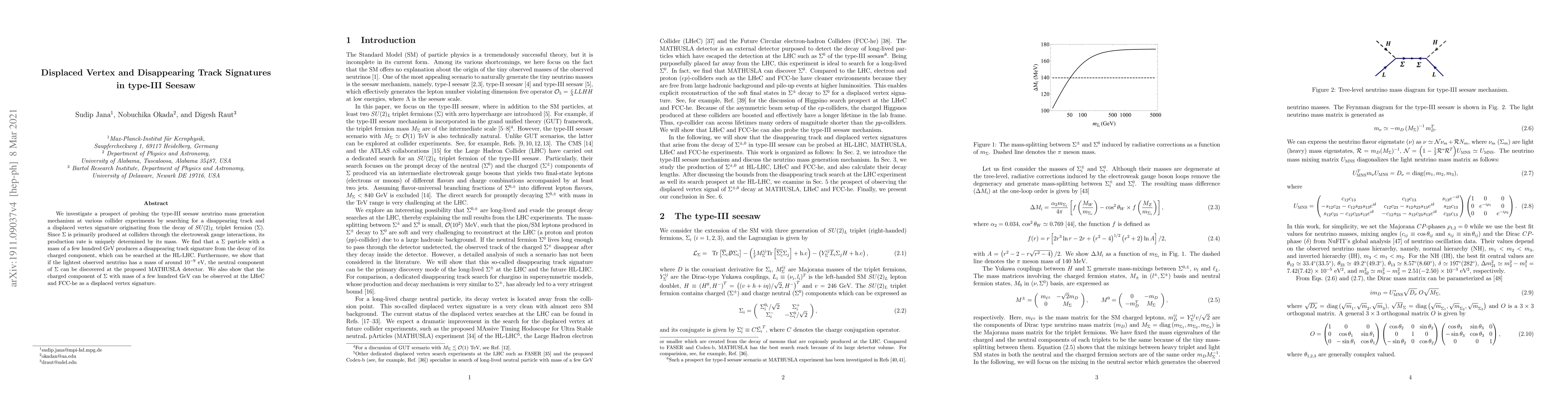 We investigate a prospect of probing the type-III seesaw neutrino mass generation mechanism at various collider experiments by searching for a disappearing track and a displaced vertex signature originating from the decay of $SU(2)_L$ triplet fermion ($\Sigma$). Since $\Sigma$ is primarily produced at colliders through the electroweak gauge interactions, its production rate is uniquely determined by its mass. We find that a $\Sigma$ particle with a mass of a few hundred GeV produces a disappearing track signature from the decay of its charged component, which can be searched at the HL-LHC. Furthermore, we show that if the lightest observed neutrino has a mass of around $10^{-9}$ eV, the neutral component of ${\Sigma}$ can be discovered at the proposed MATHUSLA detector. We also show that the charged component of ${\Sigma}$ with a mass of a few hundred GeV can be observed at the LHeC and FCC-he as a displaced vertex signature.