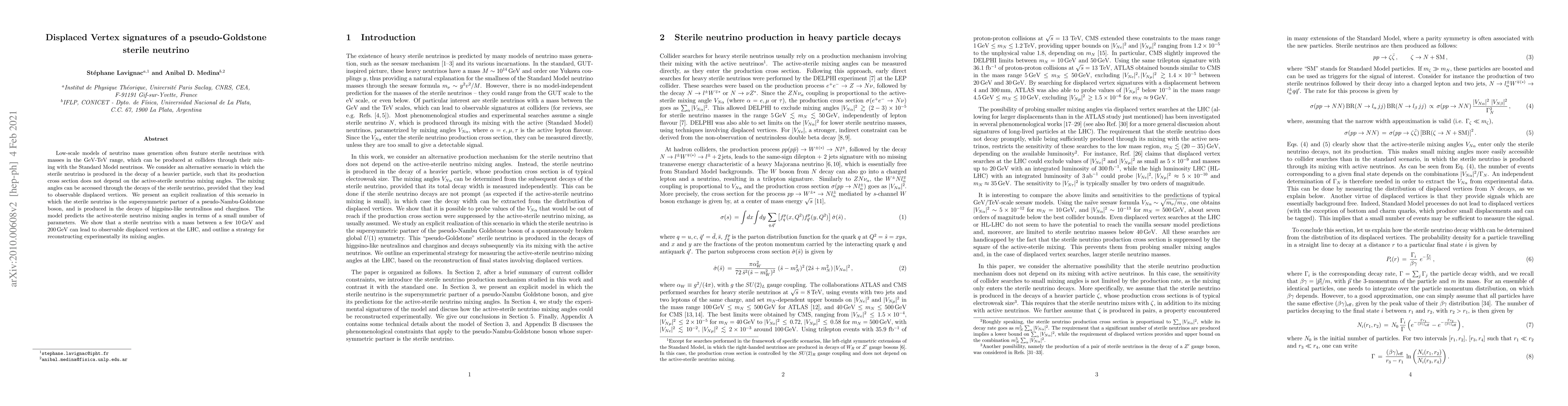 This paper explores a model of low-scale neutrino mass generation featuring a pseudo-Goldstone sterile neutrino produced via decays of higgsino-like neutralinos and charginos, leading to detectable displaced vertices at the LHC. The model predicts the active-sterile neutrino mixing angles and suggests a strategy for their experimental reconstruction.
