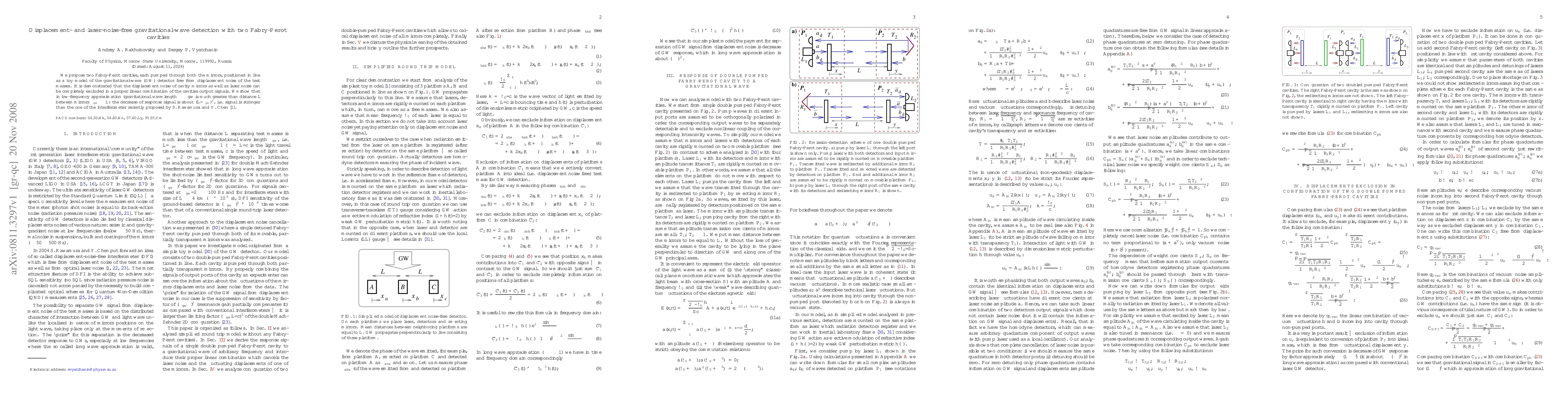 We propose two Fabry-Perot cavities, each pumped through both the mirrors, positioned in line as a toy model of the gravitational-wave (GW) detector free from displacement noise of the test masses. It is demonstrated that the displacement noise of cavity mirrors as well as laser noise can be completely excluded in a proper linear combination of the cavities output signals. We show that in low-frequency approximation (gravitational wave length $\lambda-\text{gw}$ is much greater than distance $L$ between mirrors $\lambda_\text{gw}\gg L$) the decrease of response signal is about $(L/\lambda_\text{gw})^2$, i.e. signal is stronger than the one of the interferometer recently proposed by S. Kawamura and Y. Chen.