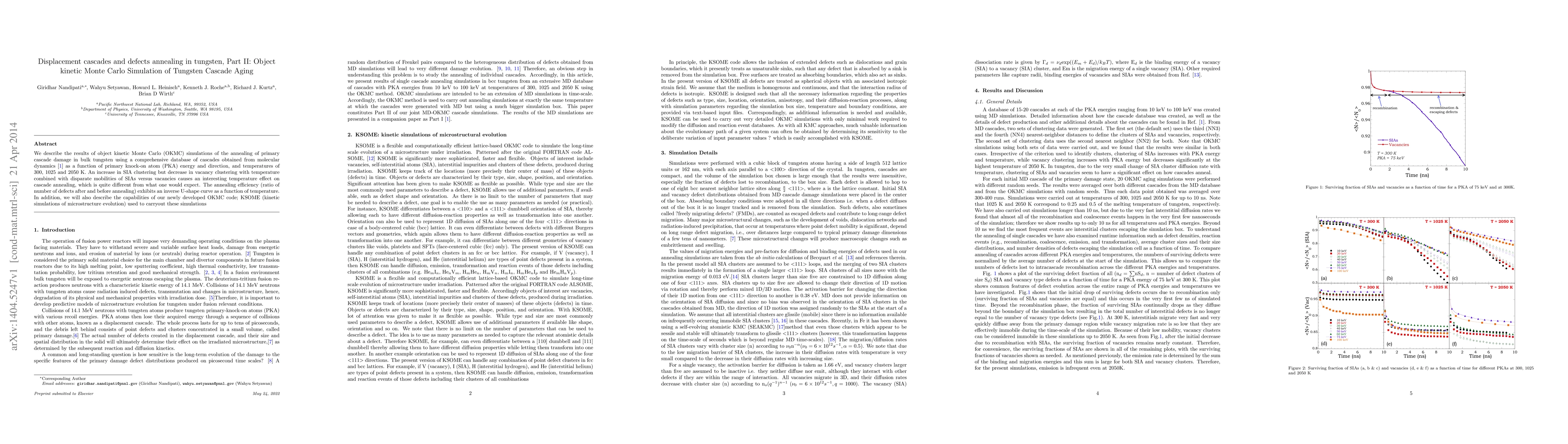 This paper presents OKMC simulations of tungsten cascade annealing, revealing an inverse U-shaped relationship between annealing efficiency and temperature due to differing mobilities of substitutional interstitials and vacancies. The study also introduces the KSOME code for these simulations.