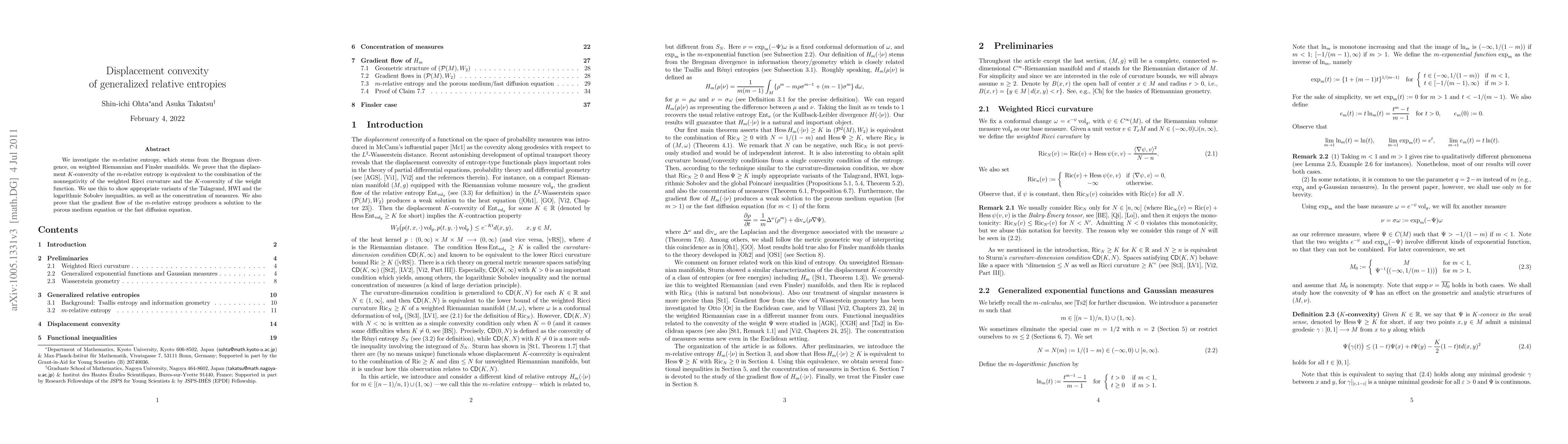 The paper investigates the $m$-relative entropy on Riemannian and Finsler manifolds, proving its displacement $K$-convexity hinges on nonnegativity of weighted Ricci curvature and $K$-convexity of the weight function. It also demonstrates implications such as Talagrand, HWI, and logarithmic Sobolev inequalities and shows the gradient flow of $m$-relative entropy solves porous medium or fast diffusion equations.