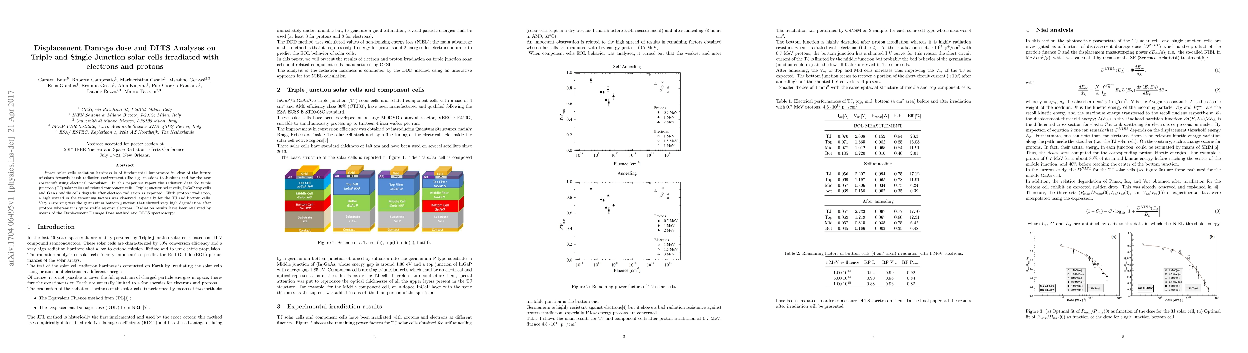 This paper investigates the radiation damage in triple junction solar cells irradiated with electrons and protons, highlighting significant degradation in performance, especially for the germanium bottom junction under proton exposure, analyzed via Displacement Damage Dose and DLTS spectroscopy.