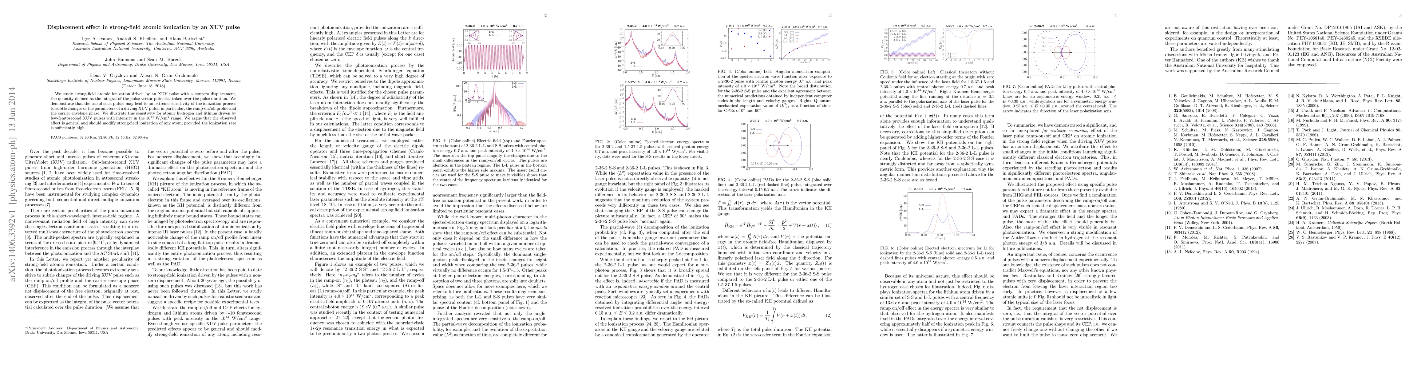 This paper investigates how strong-field atomic ionization by an XUV pulse is highly sensitive to the pulse's displacement, a measure of the integral of the pulse vector potential. The study finds that variations in the pulse's ramp-on/off profile and carrier envelope phase can significantly affect ionization, particularly in hydrogen and lithium atoms.