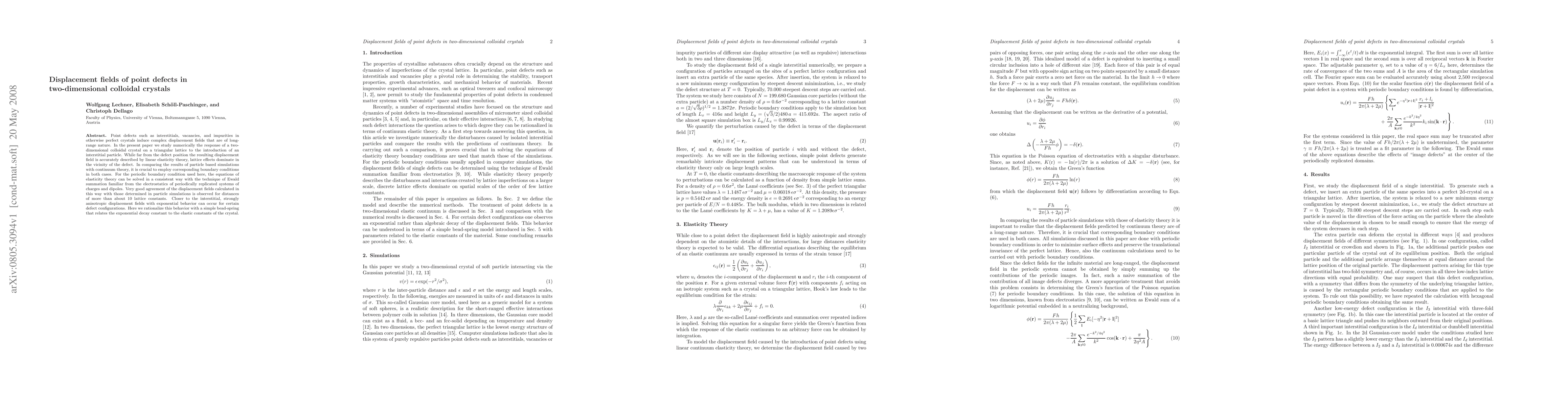 This paper numerically investigates the displacement fields induced by interstitial particles in two-dimensional colloidal crystals, finding that linear elasticity theory applies at larger distances while lattice effects dominate near the defect. The study uses Ewald summation to solve elasticity equations and observes good agreement between simulation and theory for displacements beyond 10 lattice constants.
