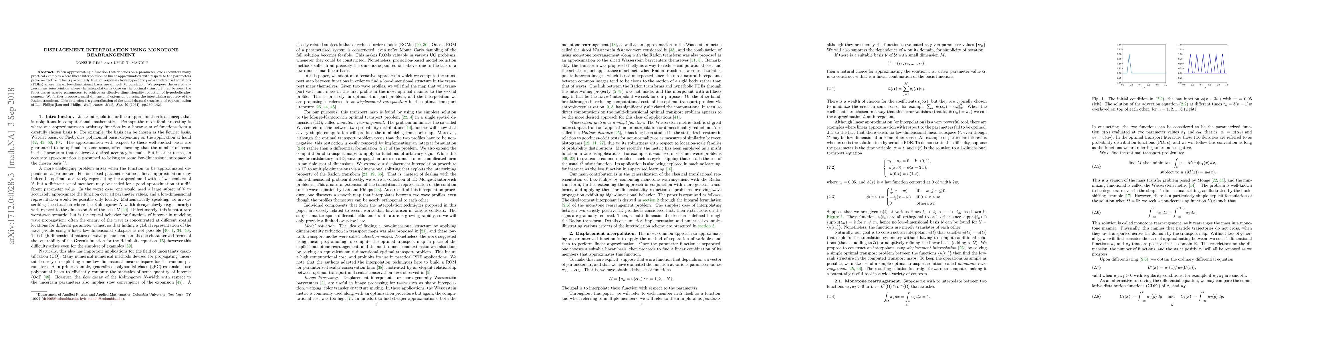 This paper proposes displacement interpolation using monotone rearrangement for effective dimensionality reduction in hyperbolic PDEs, where linear interpolation fails. The method leverages optimal transport maps and extends to multi-dimensions via the intertwining property of the Radon transform, generalizing the classical translational representation.