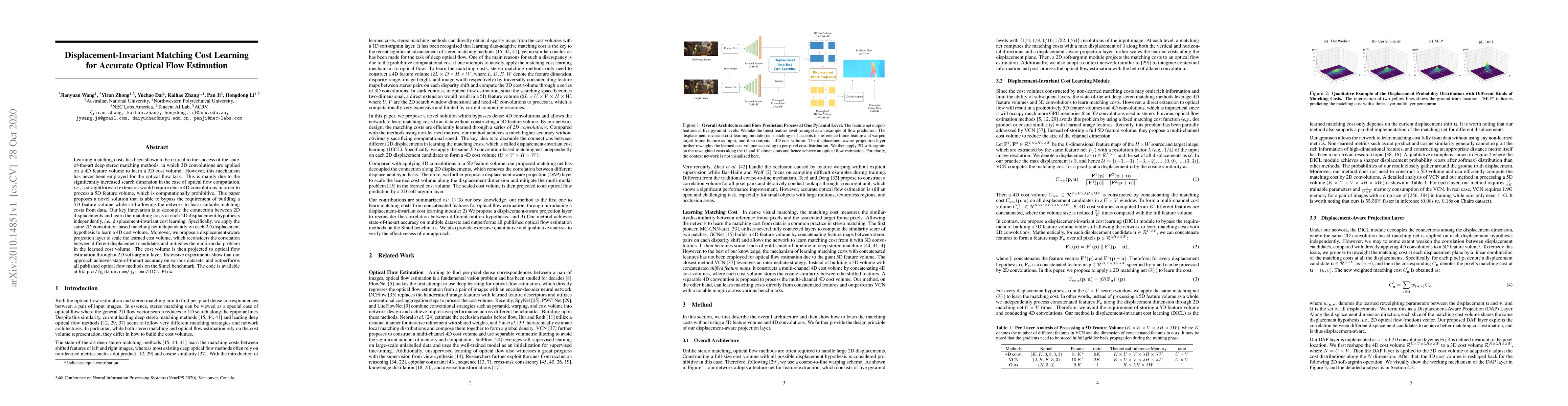 This paper proposes a novel displacement-invariant matching cost learning method for optical flow estimation, bypassing the need for computationally prohibitive 5D convolutions. It uses 2D convolutions on independent displacement hypotheses to create a 4D cost volume, enhanced by a displacement-aware projection layer, and achieves state-of-the-art performance on optical flow benchmarks.