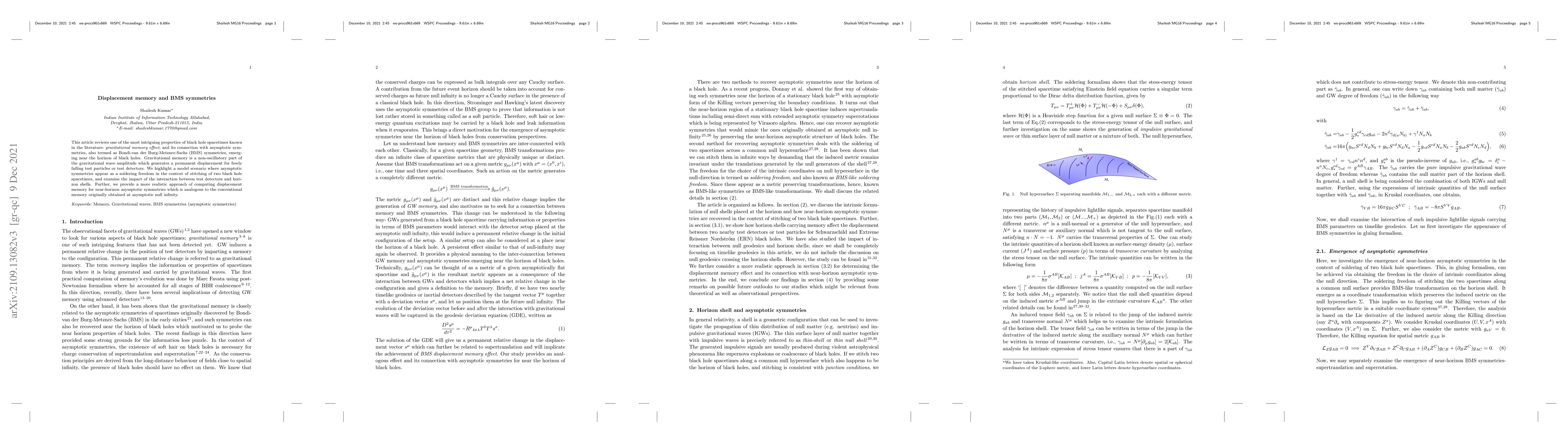 This paper reviews the gravitational memory effect, a permanent displacement caused by gravitational waves, and its relation to BMS symmetries near black hole horizons. It explores how asymptotic symmetries manifest in merging black hole spacetimes and proposes a method for computing displacement memory for near-horizon symmetries.