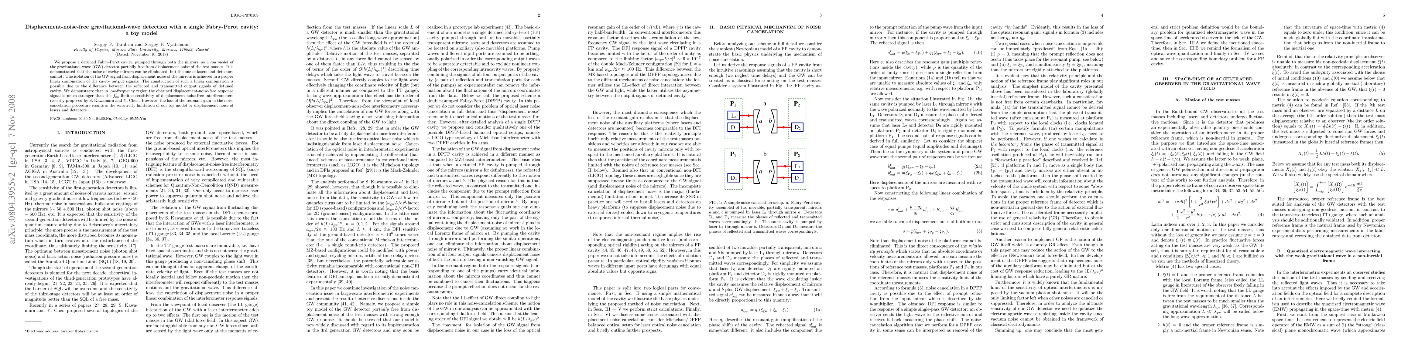 This paper proposes a detuned Fabry-Perot cavity as a simplified model for gravitational-wave detection that eliminates displacement noise from test masses. The method achieves stronger low-frequency sensitivity compared to other interferometers but is limited by laser and detector noise.