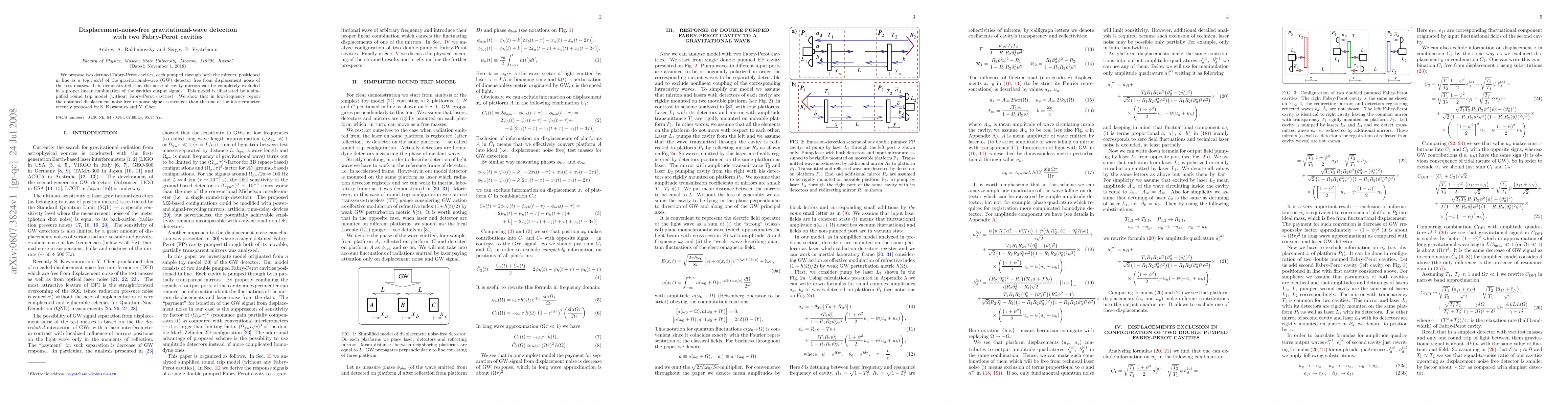 The research proposes a model of two detuned Fabry-Perot cavities, each pumped through both mirrors, positioned in line as a toy model for a gravitational-wave (GW) detector free from displacement noise of the test masses. The noise of cavity mirrors is excluded in a proper linear combination of the cavities' output signals.