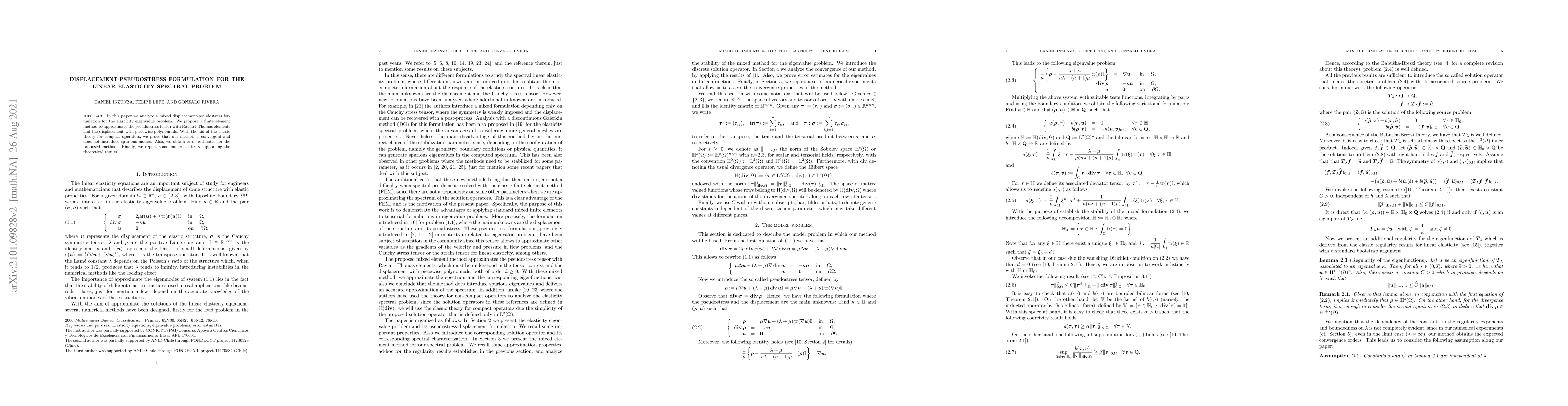 This paper proposes a mixed displacement-pseudostress finite element method for solving the linear elasticity spectral problem, using Raviart-Thomas elements for pseudostress and polynomials for displacement. Theoretical analysis proves convergence and absence of spurious modes, with numerical tests validating the method.