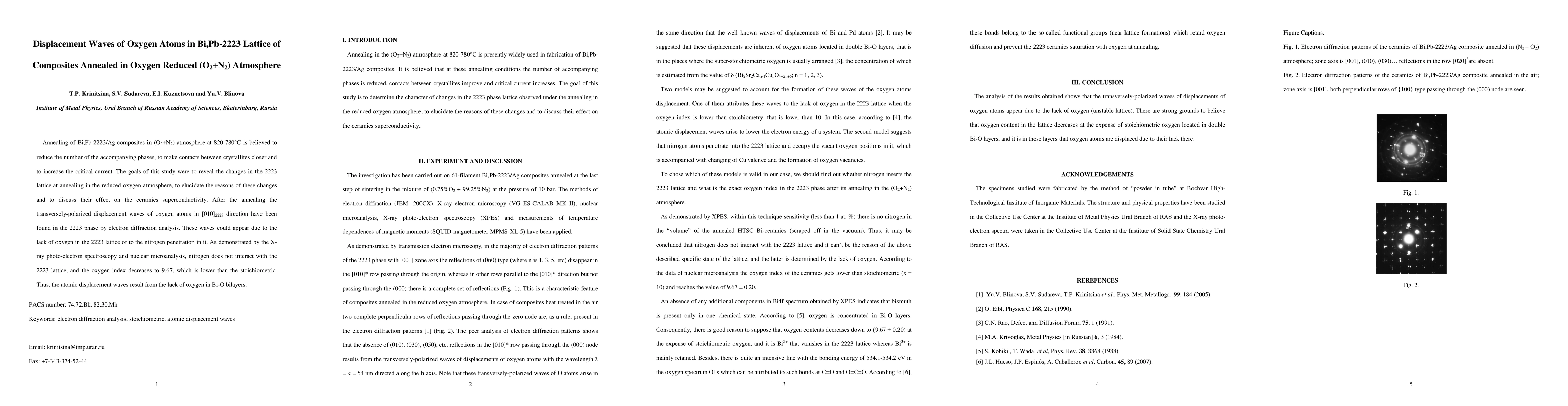 This study reveals that annealing Bi,Pb-2223/Ag composites in a reduced oxygen (O2+N2) atmosphere induces displacement waves of oxygen atoms in the 2223 lattice. These waves are attributed to oxygen deficiency, as nitrogen does not interact with the lattice and the oxygen index drops below stoichiometric, according to X-ray photo-electron spectroscopy and nuclear microanalysis.