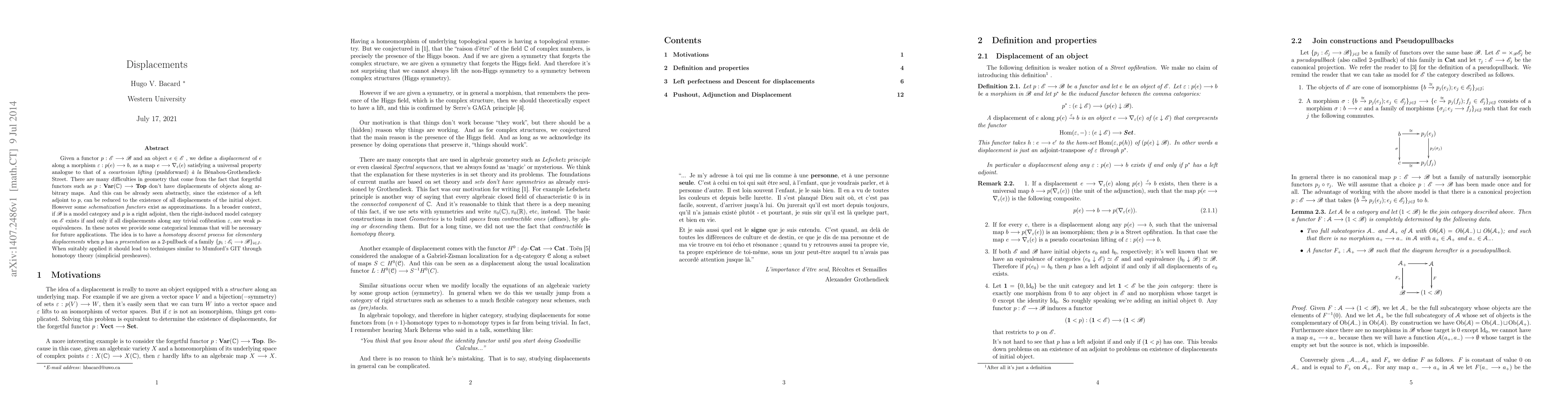 Given a functor $p:E \rightarrow B$ and an object $e \in E$ , we define a \emph{displacement} of $e$ along a morphism $\varepsilon: p(e) \rightarrow b$, as a map $e \rightarrow \nabla_\varepsilon(e)$ satisfying a universal property analogue to that of a \emph{cocartesian lifting} (pushforward) \emph{\`a la} B\'enabou-Grothendieck-Street. There are many difficulties in geometry that come from the fact that forgetful functors such as $p: Var(\mathbf{C}) \rightarrow Top $ don't have displacements of objects along arbitrary maps. And this can be already seen abstractly, since the existence of a left adjoint to $p$, can be reduced to the existence of all displacements of the initial object. However some \emph{schematization functors} exist as approximations. In a broader context, if $B$ is a model category and $p$ is a right adjoint, then the right-induced model category on $E$ exists if and only if all displacements along any trivial cofibration $\varepsilon$, are weak $p$-equivalences. In these notes we provide some categorical lemmas that will be necessary for future applications. The idea is to have a \emph{homotopy descent process} for \emph{elementary displacements} when $p$ has a \emph{presentation} as a $2$-pullback of a family $\{p_i: E_i \rightarrow B\}_{i\in J}$. When suitably applied it should lead to techniques similar to Mumford's GIT through homotopy theory (simplicial presheaves).