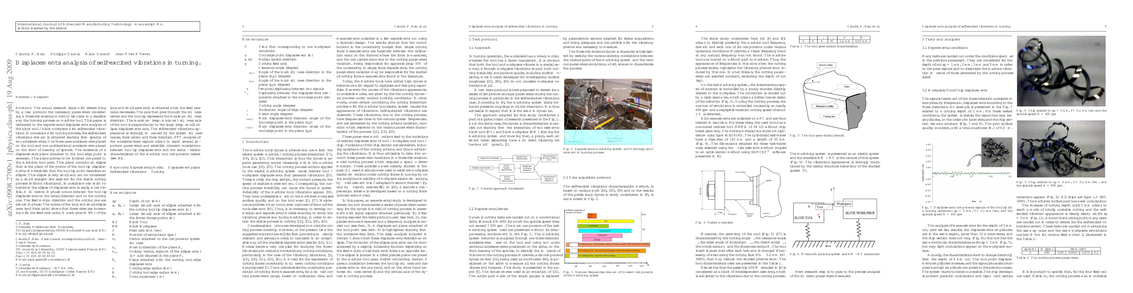 The actual research deals with determining by a new protocol the necessary parameters considering a three-dimensional model to simulate in a realistic way the turning process on machine tool. This paper is dedicated to the experimental displacements analysis of the block tool / block workpiece with self-excited vibrations. In connexion with turning process, the self-excited vibrations domain is obtained starting from spectra of two accelerometers. The existence of a displacements plane attached to the tool edge point is revealed. This plane proves to be inclined compared to the machines tool axes. We establish that the tool tip point describes an ellipse. This ellipse is very small and can be considered as a small straight line segment for the stable cutting process (without vibrations). In unstable mode (with vibrations) the ellipse of displacements is really more visible. A difference in phase occurs between the tool tip displacements on the radial direction and on the cutting one. The feed motion direction and the cutting one are almost in phase. The values of the long and small ellipse axes (and their ratio) shows that these sizes are increasing with the feed rate value. The axis that goes through the stiffness center and the tool tip represents the maximum stiffness direction. The maximum (resp. minimum) stiffness axis of the tool is perpendicular to the large (resp. small) ellipse displacements axis. FFT analysis of the accelerometers signals allows to reach several important parameters and establish coherent correlations between tool tip displacements and the static - elastic characteristics of the machine tool components tested.