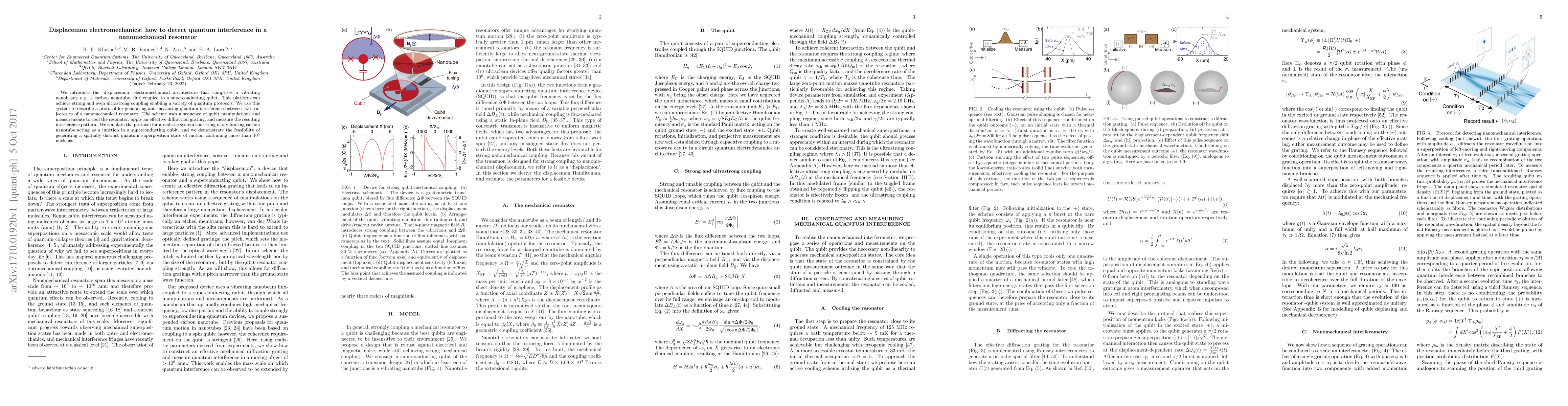 This paper introduces the `displacemon' electromechanical architecture for detecting quantum interference in a nanomechanical resonator, using a carbon nanotube coupled to a superconducting qubit. The proposed protocol successfully generates and measures quantum interference by cooling the resonator and applying an effective diffraction grating.