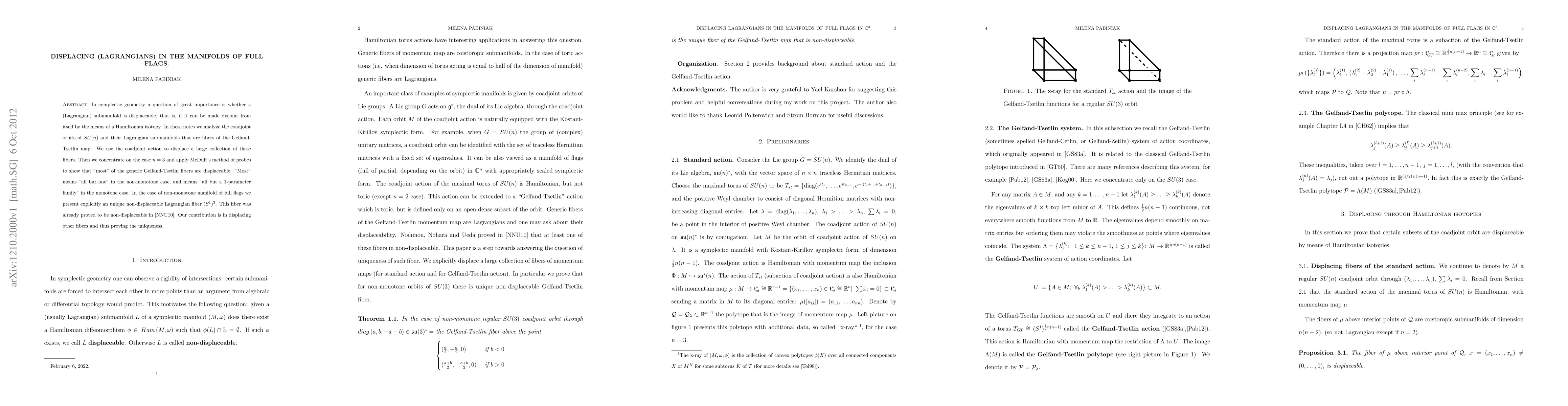 In symplectic geometry a question of great importance is whether a (Lagrangian) submanifold is displaceable, that is, if it can be made disjoint from itself by the means of a Hamiltonian isotopy. In these notes we analyze the coadjoint orbits of SU(n) and their Lagrangian submanifolds that are fibers of the Gelfand-Tsetlin map. We use the coadjoint action to displace a large collection of these fibers. Then we concentrate on the case n=3 and apply McDuff's method of probes to show that "most" of the generic Gelfand-Tsetlin fibers are displaceable. "Most" means "all but one" in the non-monotone case, and means "all but a 1-parameter family" in the monotone case. In the case of non-monotone manifold of full flags we present explicitly an unique non-displaceable Lagrangian fiber (S^1)^3. This fiber was already proved to be non-displaceable in \cite{NNU}. Our contribution is in displacing other fibers and thus proving the uniqueness.