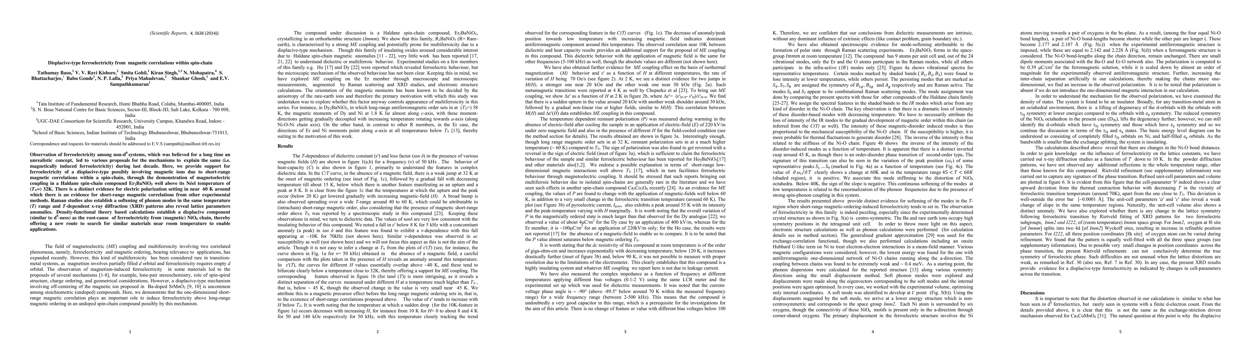 Observation of ferroelectricity among non-d0 systems, which was believed for a long time an unrealistic concept, led to various proposals for the mechanisms to explain the same (i.e. magnetically induced ferroelectricity) during last decade. Here, we provide support for ferroelectricity of a displacive-type possibly involving magnetic ions due to short-range magnetic correlations within a spin-chain, through the demonstration of magnetoelectric coupling in a Haldane spin-chain compound Er2BaNiO5 well above its N\'eel temperature of (TN=) 32K. There is a distinct evidence for electric polarization setting in near 60 K around which there is an evidence for short-range magnetic correlations from other experimental methods. Raman studies also establish a softening of phonon modes in the same temperature (T) range and T-dependent x-ray diffraction (XRD) patterns also reveal lattice parameters anomalies. Density-functional theory based calculations establish a displacive component (similar to d0-ness) as the root-cause of ferroelectricity from (magnetic) NiO6 chain, thereby offering a new route to search for similar materials near room temperature to enable applications.