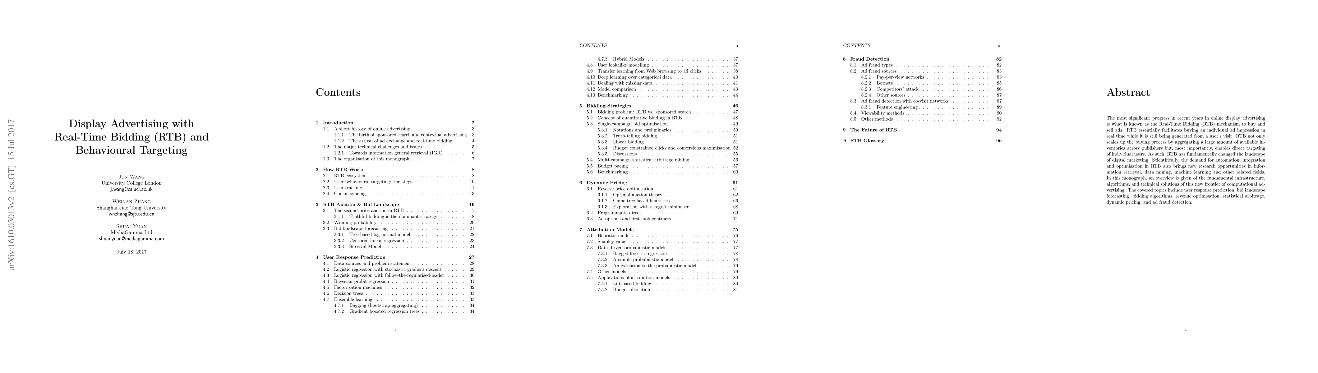 This paper provides an overview of Real-Time Bidding (RTB) in online display advertising, highlighting its role in scaling ad buying and enabling behavioural targeting. It covers key topics such as user response prediction, bidding algorithms, revenue optimization, and ad fraud detection.