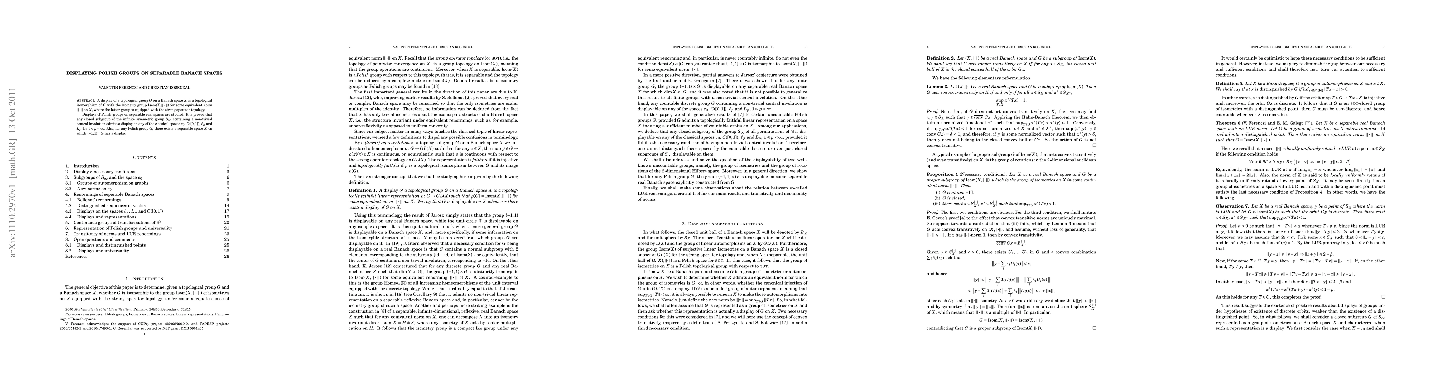 This paper investigates the displays of Polish groups on separable Banach spaces, proving that specific closed subgroups of the infinite symmetric group can be displayed on classical spaces like c0, C([0,1]), lp, and Lp for 1 ≤ p < ∞. It also establishes that any Polish group G can be displayed on a separable space with {-1,1} x G.