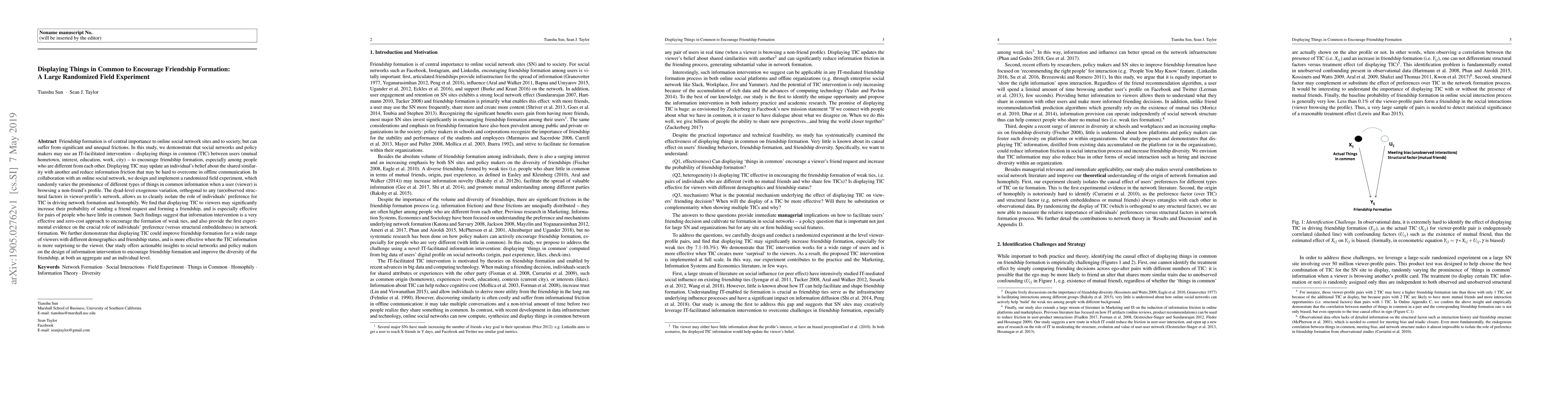 This study explores how displaying things in common (TIC) between users on social networks can enhance friendship formation through an IT-facilitated intervention. The randomized field experiment found that highlighting mutual attributes significantly boosts the likelihood of friend requests and friendships, particularly for those with fewer shared traits.