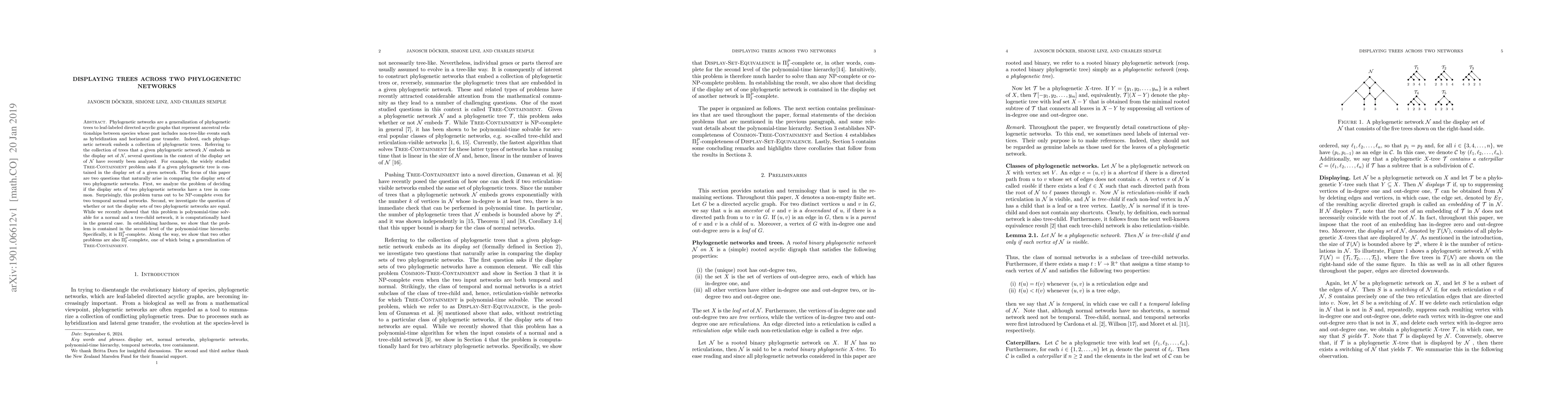 Phylogenetic networks are a generalization of phylogenetic trees to leaf-labeled directed acyclic graphs that represent ancestral relationships between species whose past includes non-tree-like events such as hybridization and horizontal gene transfer. Indeed, each phylogenetic network embeds a collection of phylogenetic trees. Referring to the collection of trees that a given phylogenetic network $N$ embeds as the display set of $N$, several questions in the context of the display set of $N$ have recently been analyzed. For example, the widely studied Tree-Containment problem asks if a given phylogenetic tree is contained in the display set of a given network. The focus of this paper are two questions that naturally arise in comparing the display sets of two phylogenetic networks. First, we analyze the problem of deciding if the display sets of two phylogenetic networks have a tree in common. Surprisingly, this problem turns out to be NP-complete even for two temporal normal networks. Second, we investigate the question of whether or not the display sets of two phylogenetic networks are equal. While we recently showed that this problem is polynomial-time solvable for a normal and a tree-child network, it is computationally hard in the general case. In establishing hardness, we show that the problem is contained in the second level of the polynomial-time hierarchy. Specifically, it is $\Pi_2^P$-complete. Along the way, we show that two other problems are also $\Pi_2^P$-complete, one of which being a generalization of Tree-Containment.