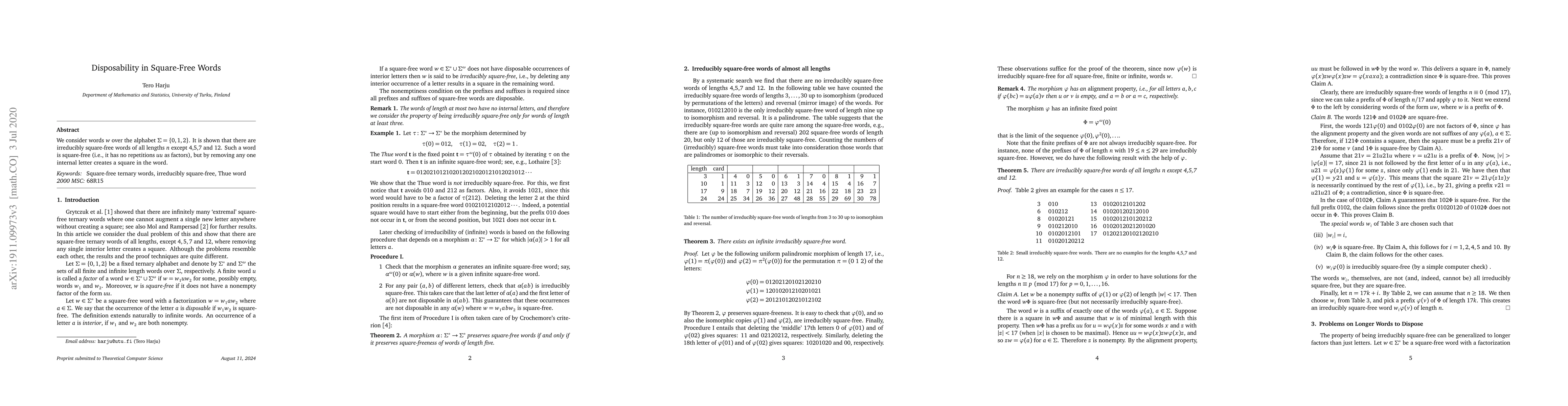 We consider words $w$ over the alphabet $\Sigma=\{0,1,2\}$. It is shown that there are irreducibly square-free words of all lengths $n$ except 4,5,7 and 12. Such a word is square-free (i.e., it has no repetitions $uu$ as factors), but by removing any one internal letter creates a square in the word.