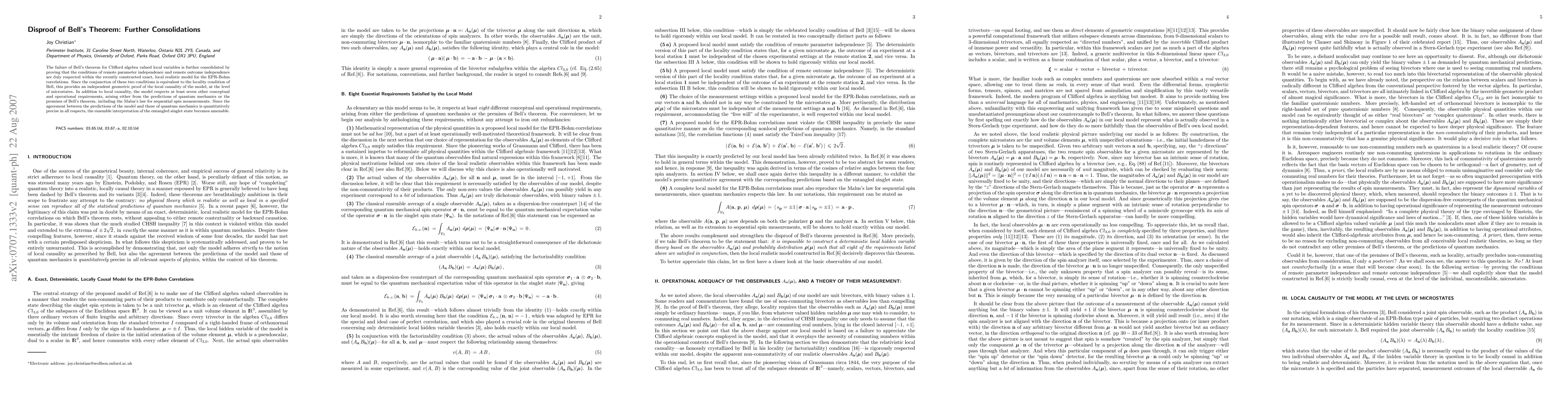 This paper consolidates the disproof of Bell's theorem using Clifford algebra, demonstrating that a local realistic model respects remote parameter and outcome independence, thus upholding local causality. The model also aligns with quantum mechanics predictions and respects additional operational requirements.
