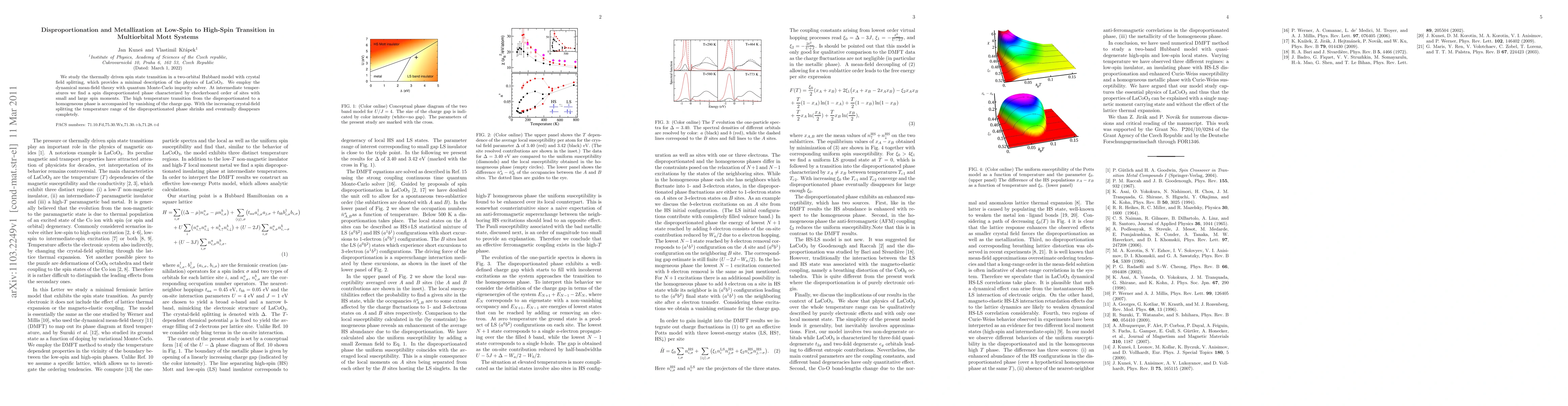We study the thermally driven spin state transition in a two-orbital Hubbard model with crystal field splitting, which provides a minimal description of the physics of LaCoO3. We employ the dynamical mean-field theory with quantum Monte-Carlo impurity solver. At intermediate temperatures we find a spin disproportionated phase characterized by checkerboard order of sites with small and large spin moments. The high temperature transition from the disproportionated to a homogeneous phase is accompanied by vanishing of the charge gap. With the increasing crystal-field splitting the temperature range of the disproportionated phase shrinks and eventually disappears completely.