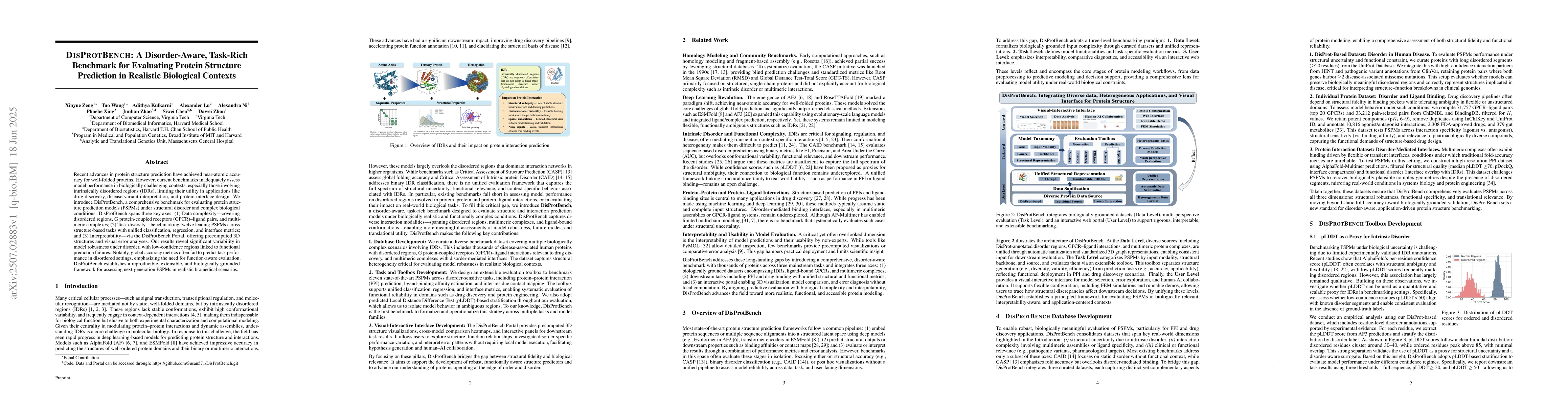 Recent advances in protein structure prediction have achieved near-atomic accuracy for well-folded proteins. However, current benchmarks inadequately assess model performance in biologically challenging contexts, especially those involving intrinsically disordered regions (IDRs), limiting their utility in applications such as drug discovery, disease variant interpretation, and protein interface design. We introduce DisProtBench, a comprehensive benchmark for evaluating protein structure prediction models (PSPMs) under structural disorder and complex biological conditions. DisProtBench spans three key axes: (1) Data complexity, covering disordered regions, G protein-coupled receptor (GPCR) ligand pairs, and multimeric complexes; (2) Task diversity, benchmarking twelve leading PSPMs across structure-based tasks with unified classification, regression, and interface metrics; and (3) Interpretability, via the DisProtBench Portal, which provides precomputed 3D structures and visual error analyses. Our results reveal significant variability in model robustness under disorder, with low-confidence regions linked to functional prediction failures. Notably, global accuracy metrics often fail to predict task performance in disordered settings, emphasizing the need for function-aware evaluation. DisProtBench establishes a reproducible, extensible, and biologically grounded framework for assessing next-generation PSPMs in realistic biomedical scenarios.
