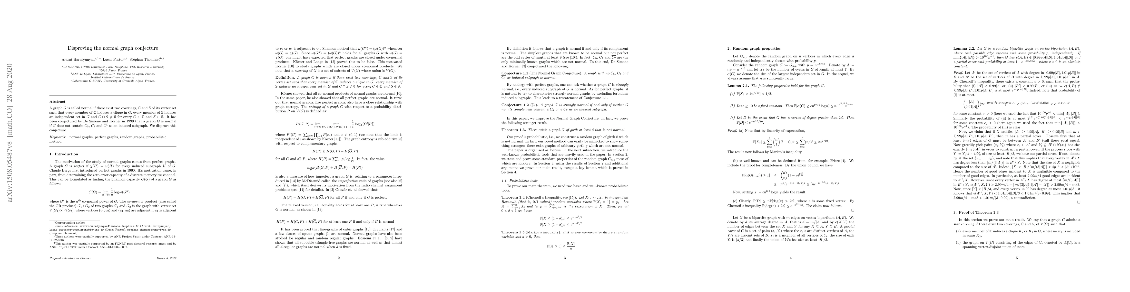 This research disproves the 1999 normal graph conjecture proposed by De Simone and Körner. The conjecture suggested that a graph without certain specific subgraphs would be normal, but the paper presents a counterexample demonstrating the conjecture's fallacy.