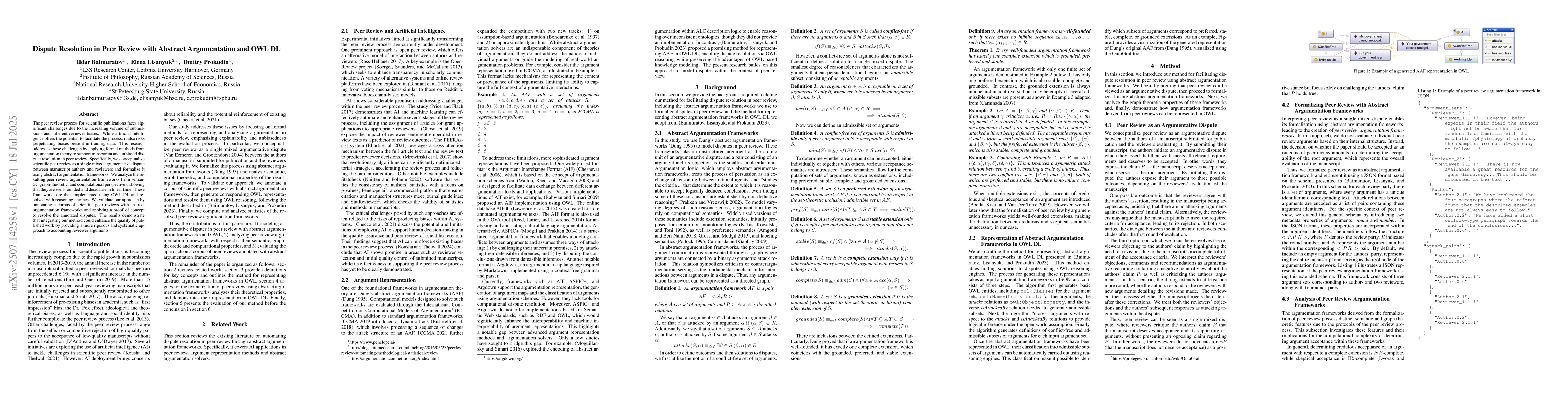 The peer review process for scientific publications faces significant challenges due to the increasing volume of submissions and inherent reviewer biases. While artificial intelligence offers the potential to facilitate the process, it also risks perpetuating biases present in training data. This research addresses these challenges by applying formal methods from argumentation theory to support transparent and unbiased dispute resolution in peer review. Specifically, we conceptualize scientific peer review as a single mixed argumentative dispute between manuscript authors and reviewers and formalize it using abstract argumentation frameworks. We analyze the resulting peer review argumentation frameworks from semantic, graph-theoretic, and computational perspectives, showing that they are well-founded and decidable in linear time. These frameworks are then implemented using OWL DL and resolved with reasoning engines. We validate our approach by annotating a corpus of scientific peer reviews with abstract argumentation frameworks and applying a proof of concept to resolve the annotated disputes. The results demonstrate that integrating our method could enhance the quality of published work by providing a more rigorous and systematic approach to accounting reviewer arguments.