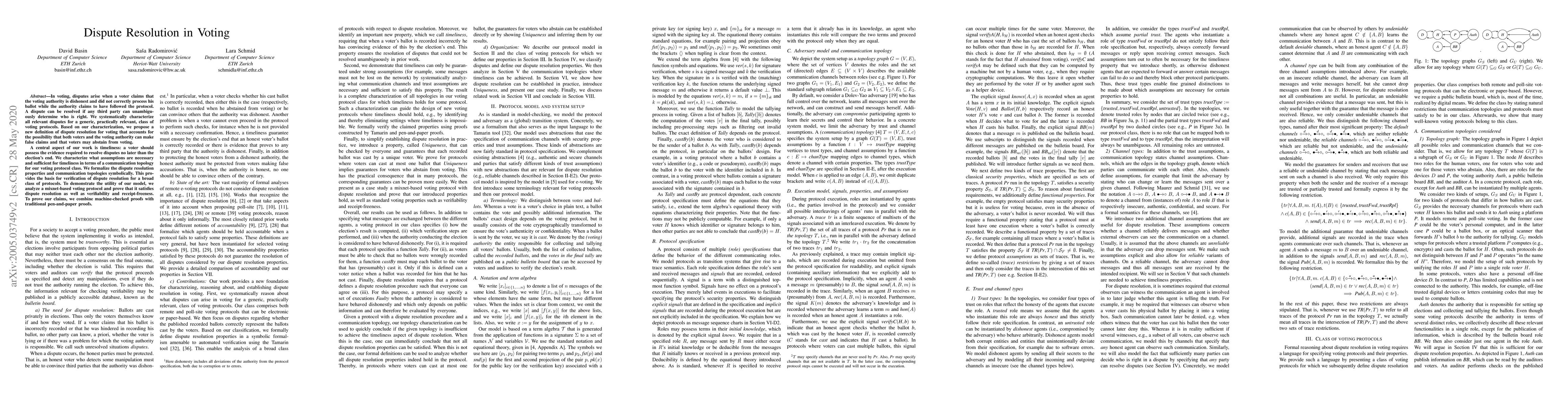 This paper systematically characterizes disputes in voting protocols where voters and authorities claim ballot processing errors. It proposes a new definition of dispute resolution that considers false claims and voter abstention, emphasizing timeliness for evidence availability. The authors formalize dispute resolution properties and communication topologies, demonstrating their model's utility through a mixnet-based protocol analysis combining machine-checked and traditional proofs.