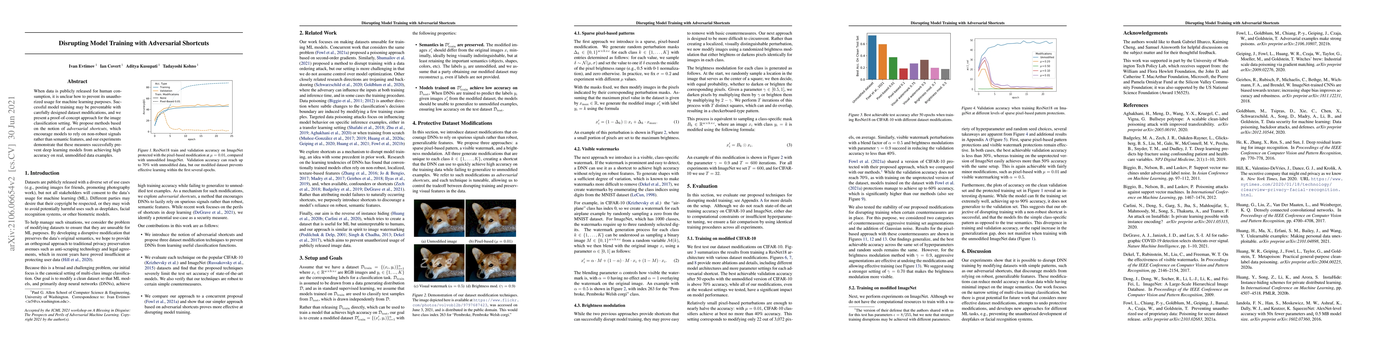 When data is publicly released for human consumption, it is unclear how to prevent its unauthorized usage for machine learning purposes. Successful model training may be preventable with carefully designed dataset modifications, and we present a proof-of-concept approach for the image classification setting. We propose methods based on the notion of adversarial shortcuts, which encourage models to rely on non-robust signals rather than semantic features, and our experiments demonstrate that these measures successfully prevent deep learning models from achieving high accuracy on real, unmodified data examples.