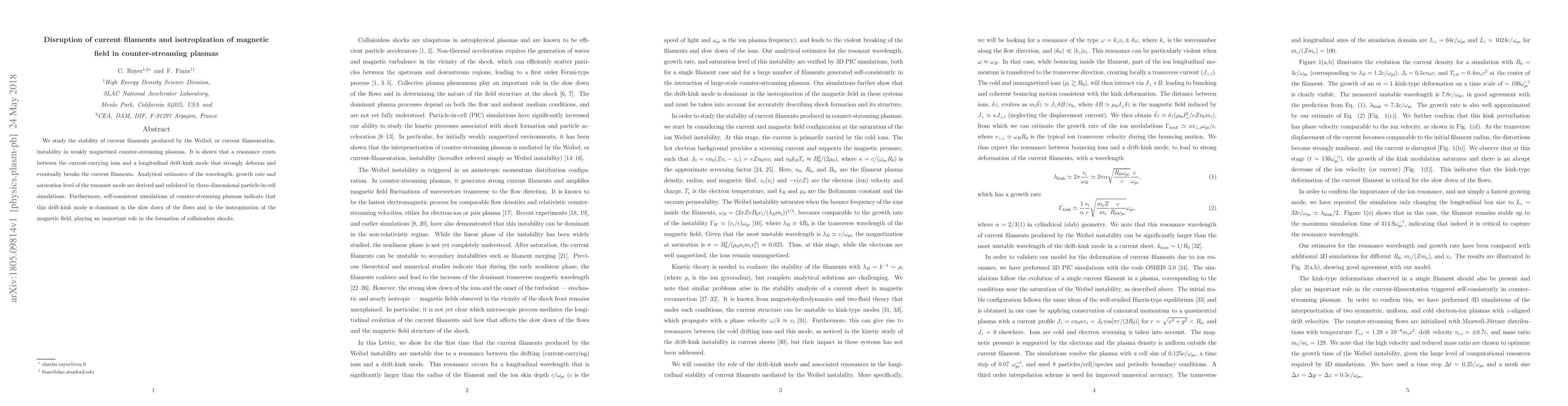 This paper investigates the stability of current filaments in weakly magnetized counter-streaming plasmas, revealing a resonance between ions and a drift-kink mode that disrupts these filaments. The study finds this mode crucial for slowing down flows and isotropizing magnetic fields, significantly impacting collisionless shock formation.