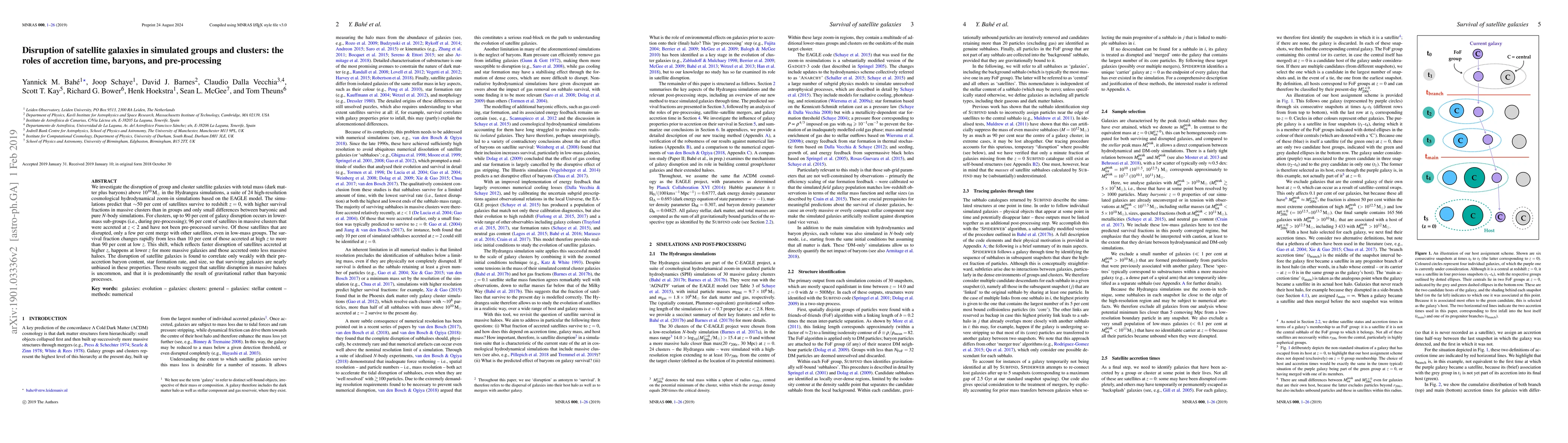 This study using the Hydrangea simulations finds that about 50% of satellite galaxies in groups and clusters survive to redshift z = 0, with higher survival rates in massive clusters. Disruption is primarily driven by gravitational processes rather than baryonic factors, with most disruption occurring in lower-mass sub-groups before the satellites enter larger clusters.